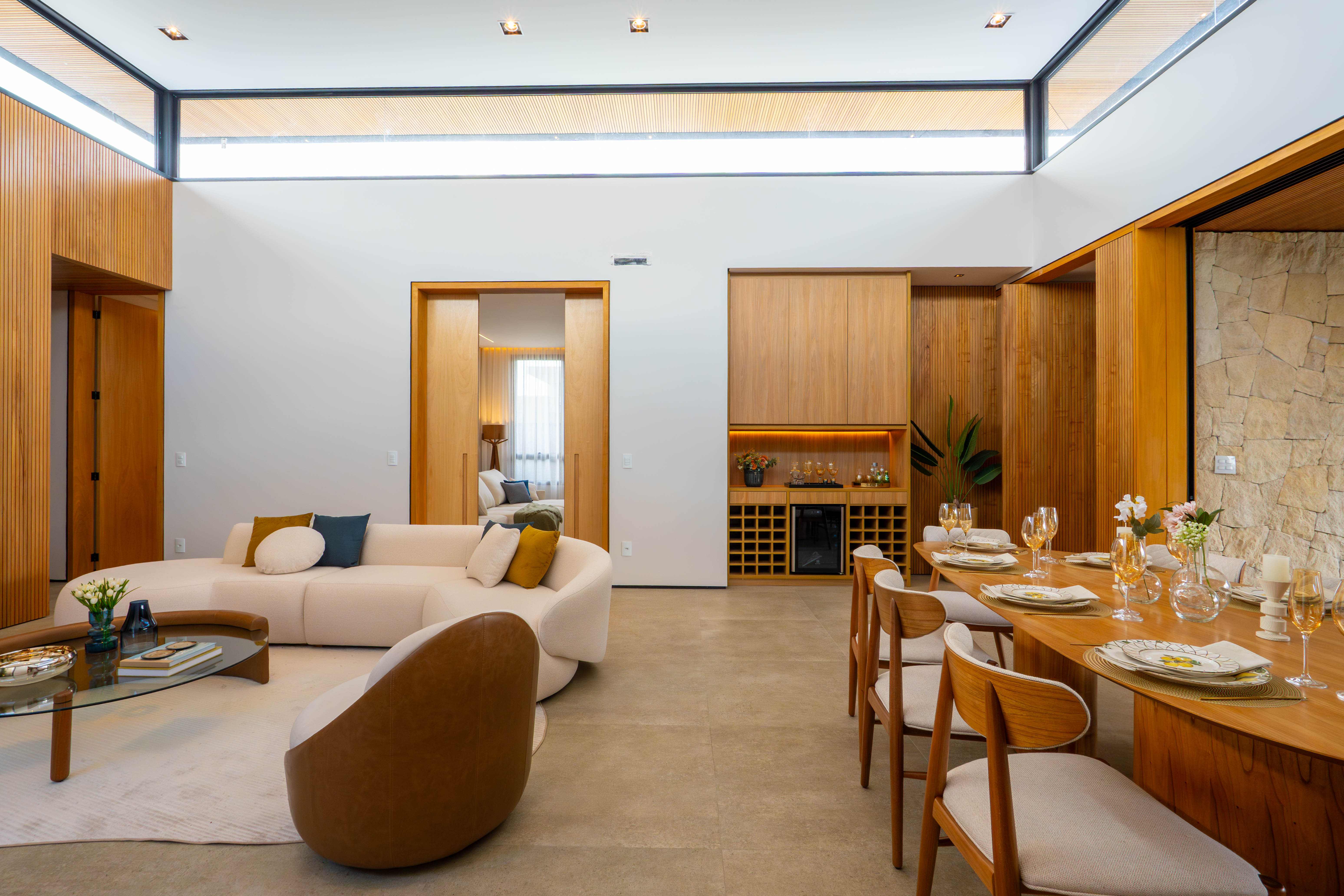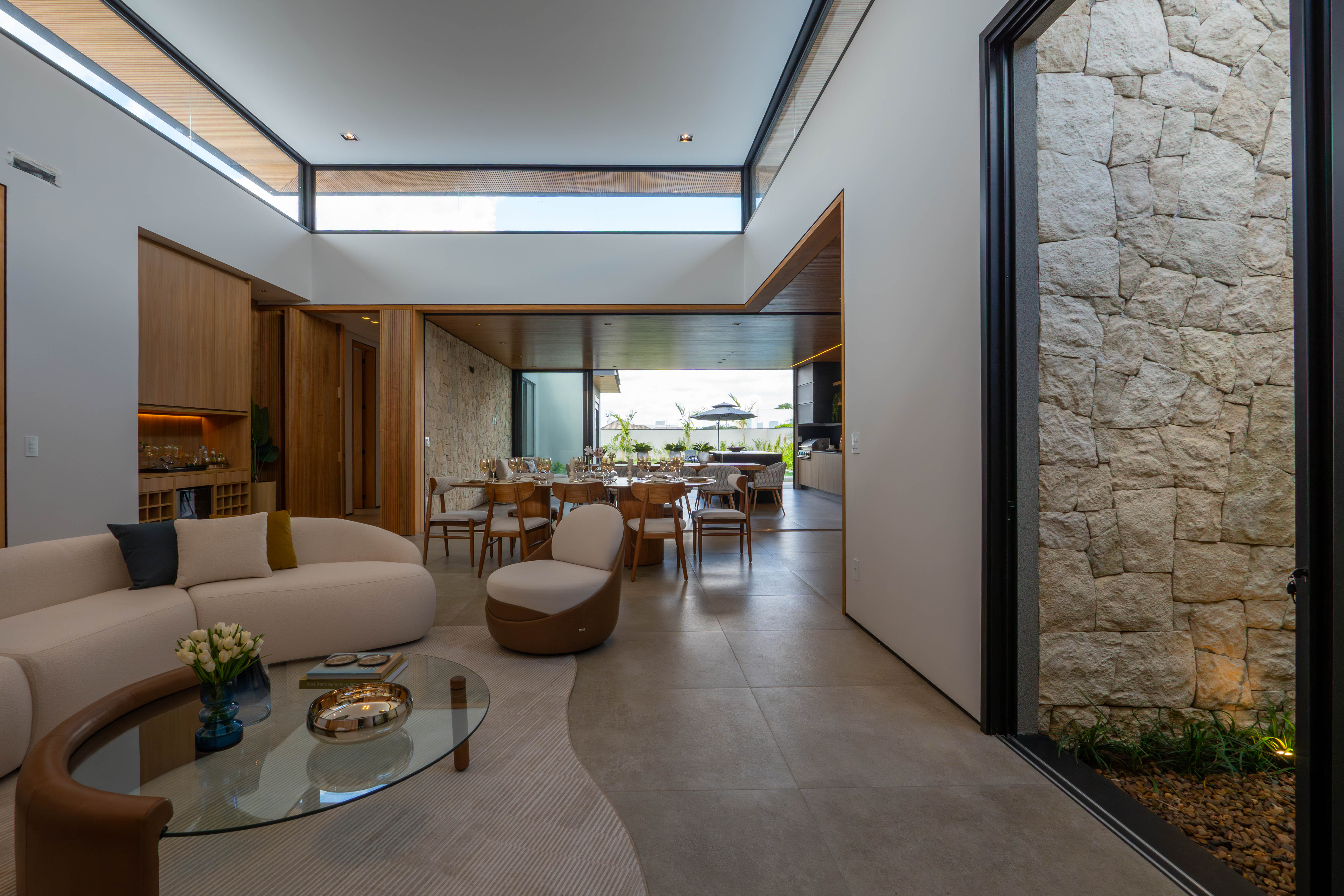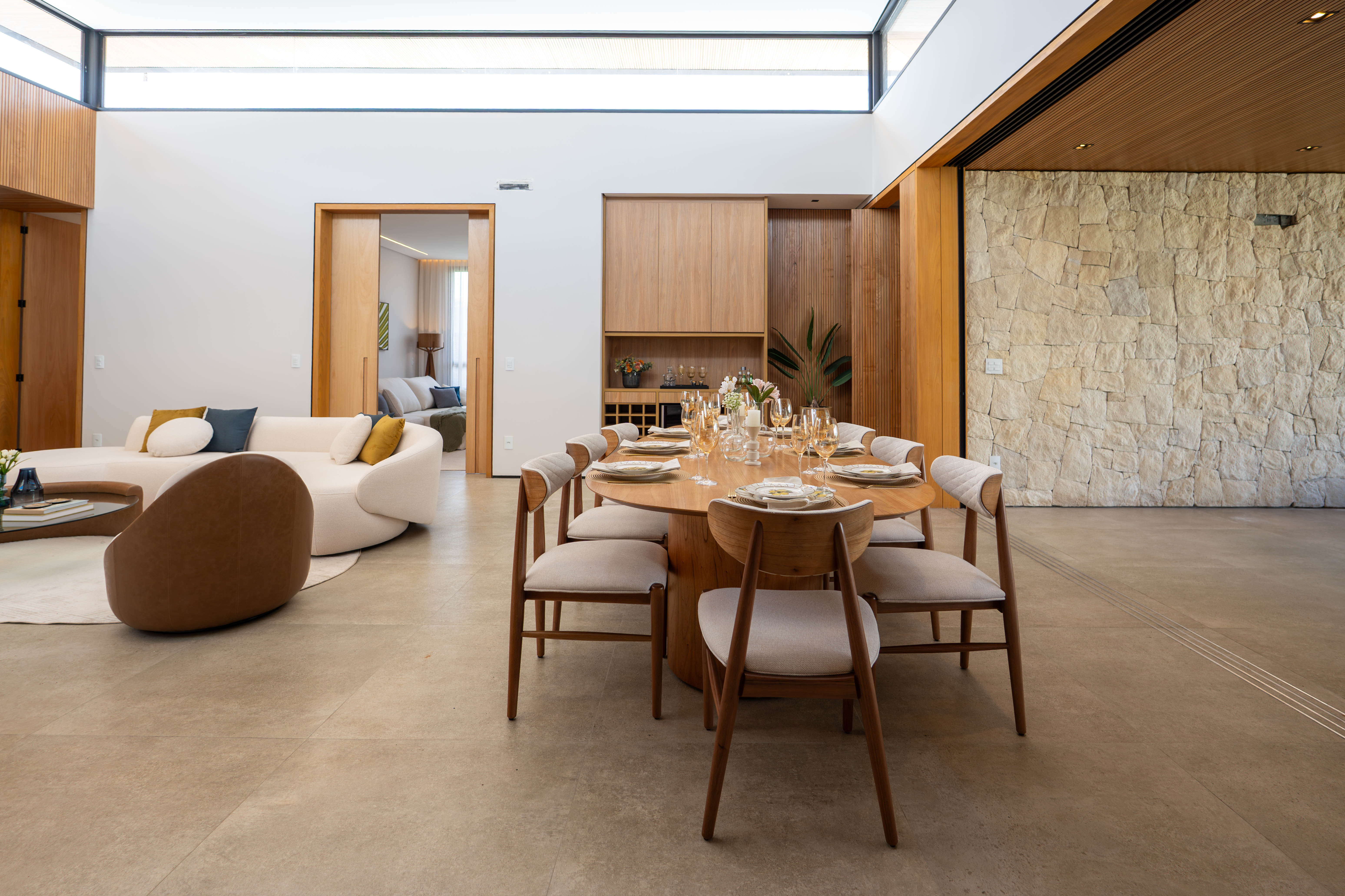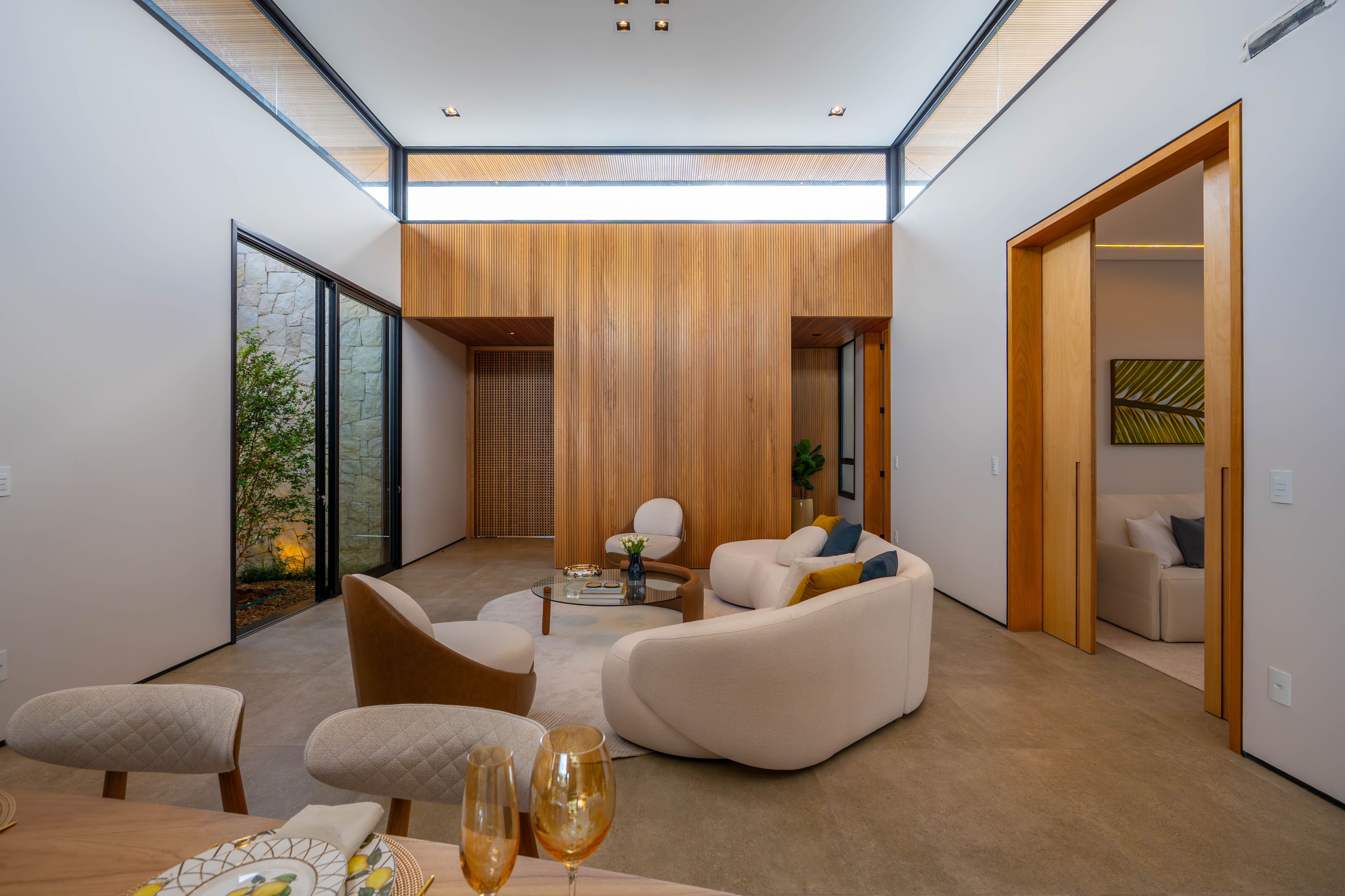 - Sala de estar integrada com sala de jantar, cozinha e jardim de inverno (planta jaboticabeira)