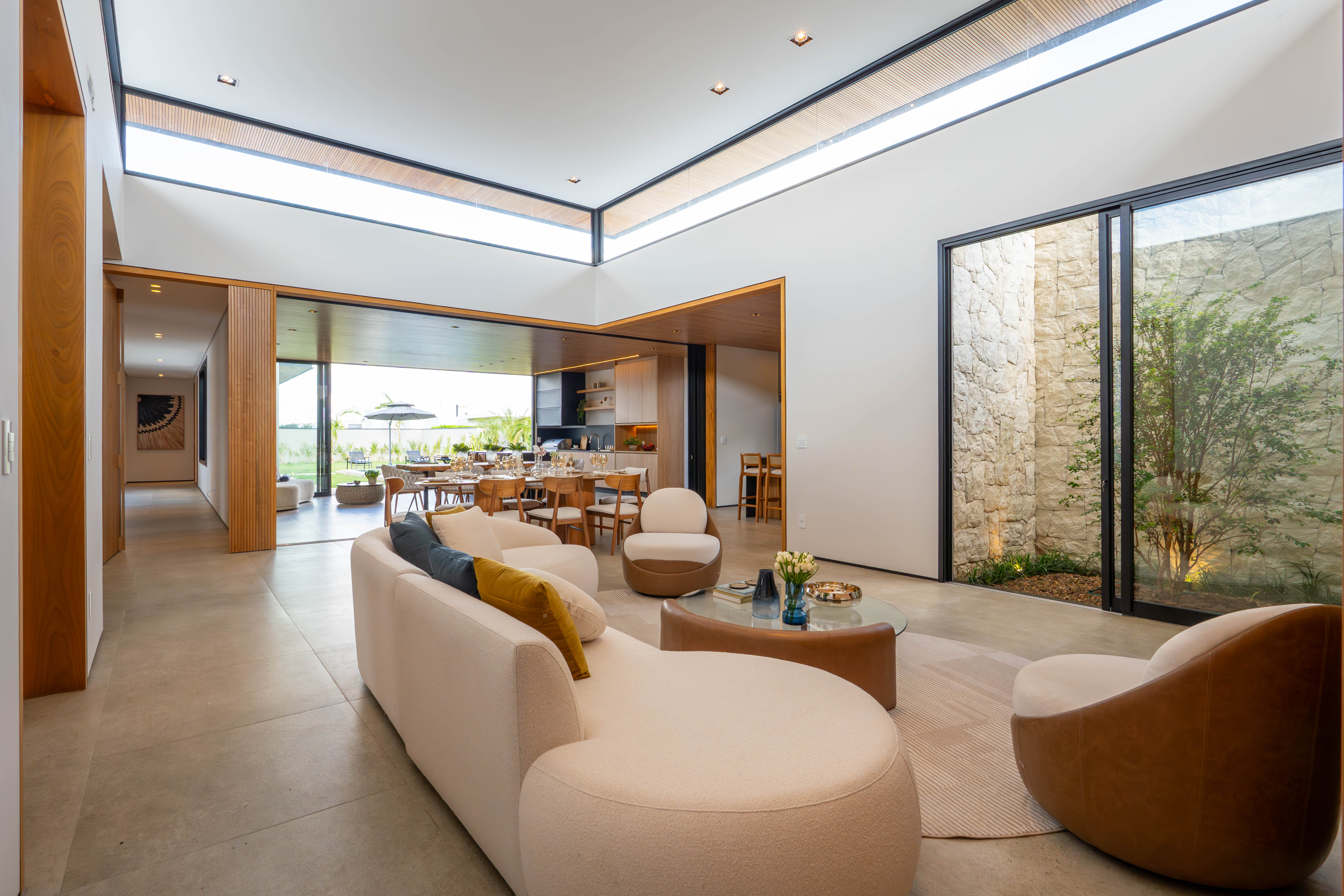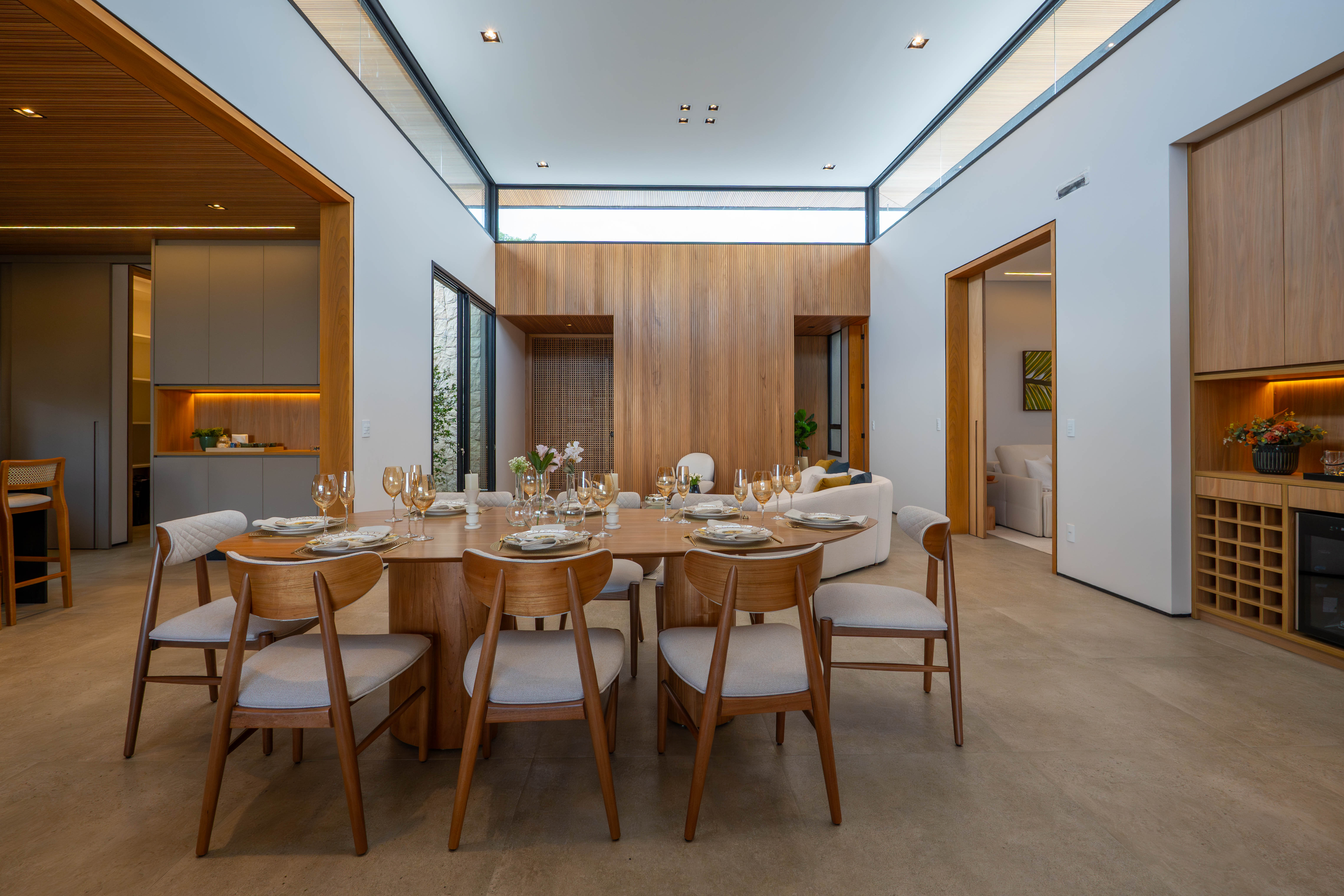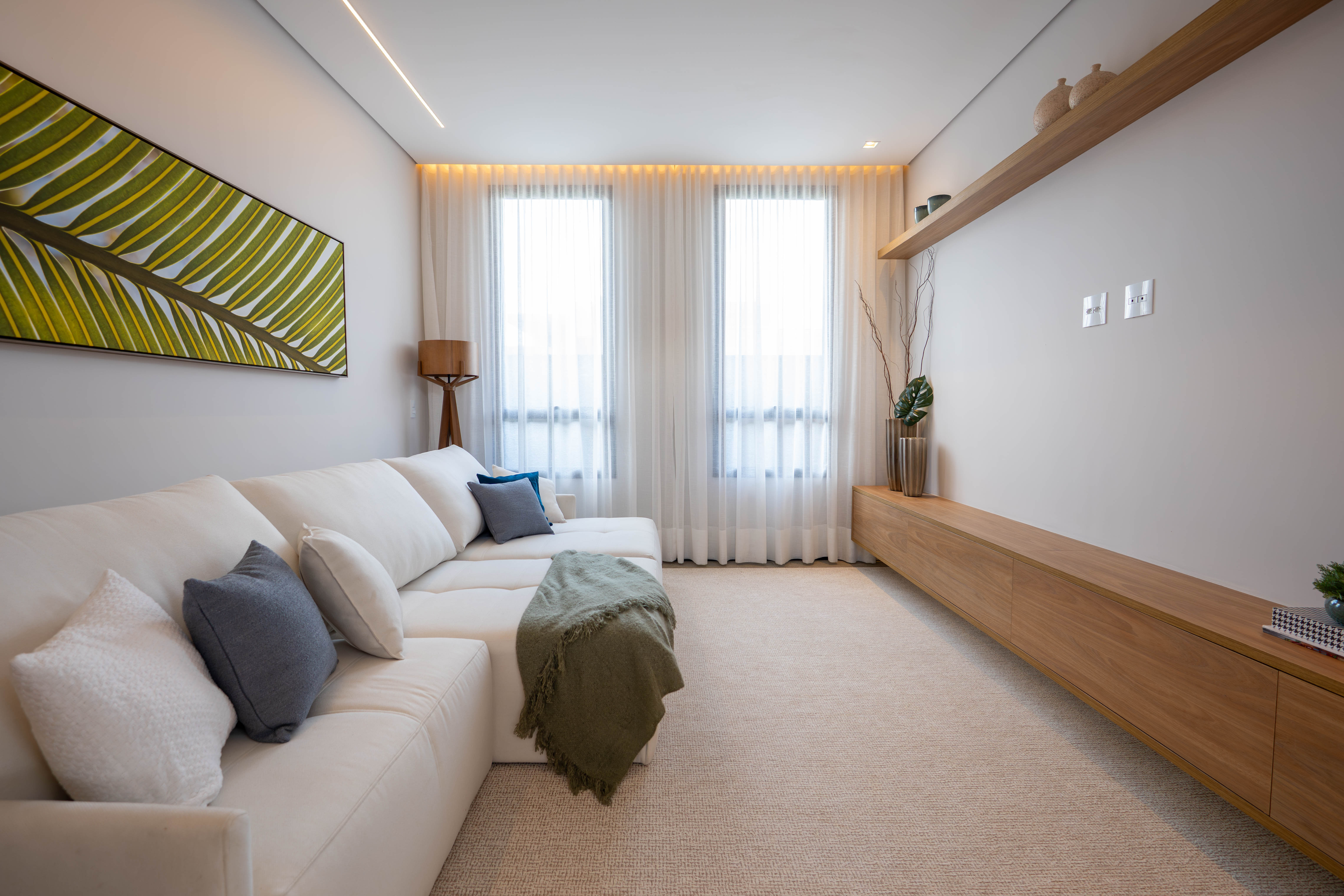 - Sala de estar integrada com sala de jantar, cozinha e jardim de inverno (planta jaboticabeira)