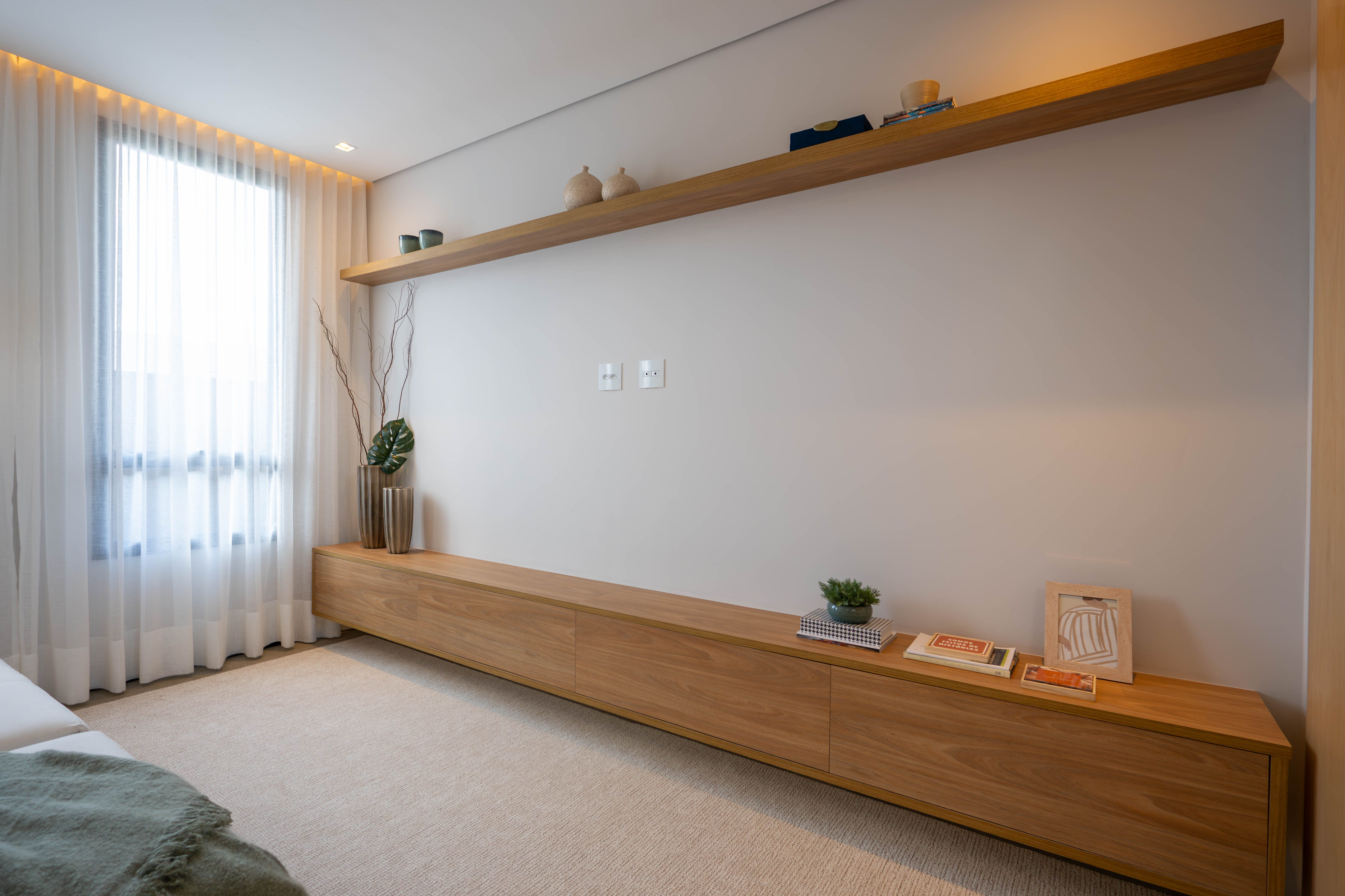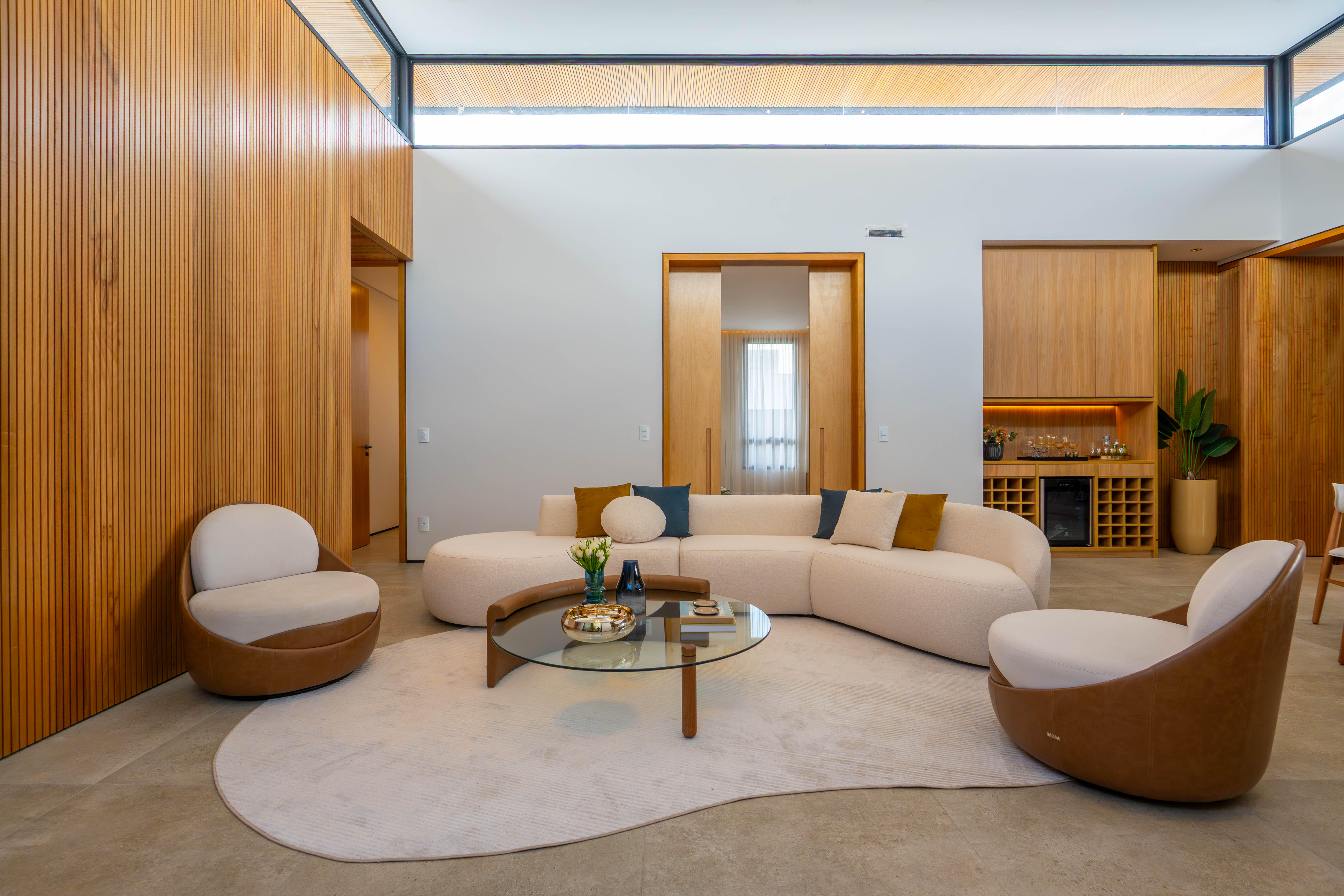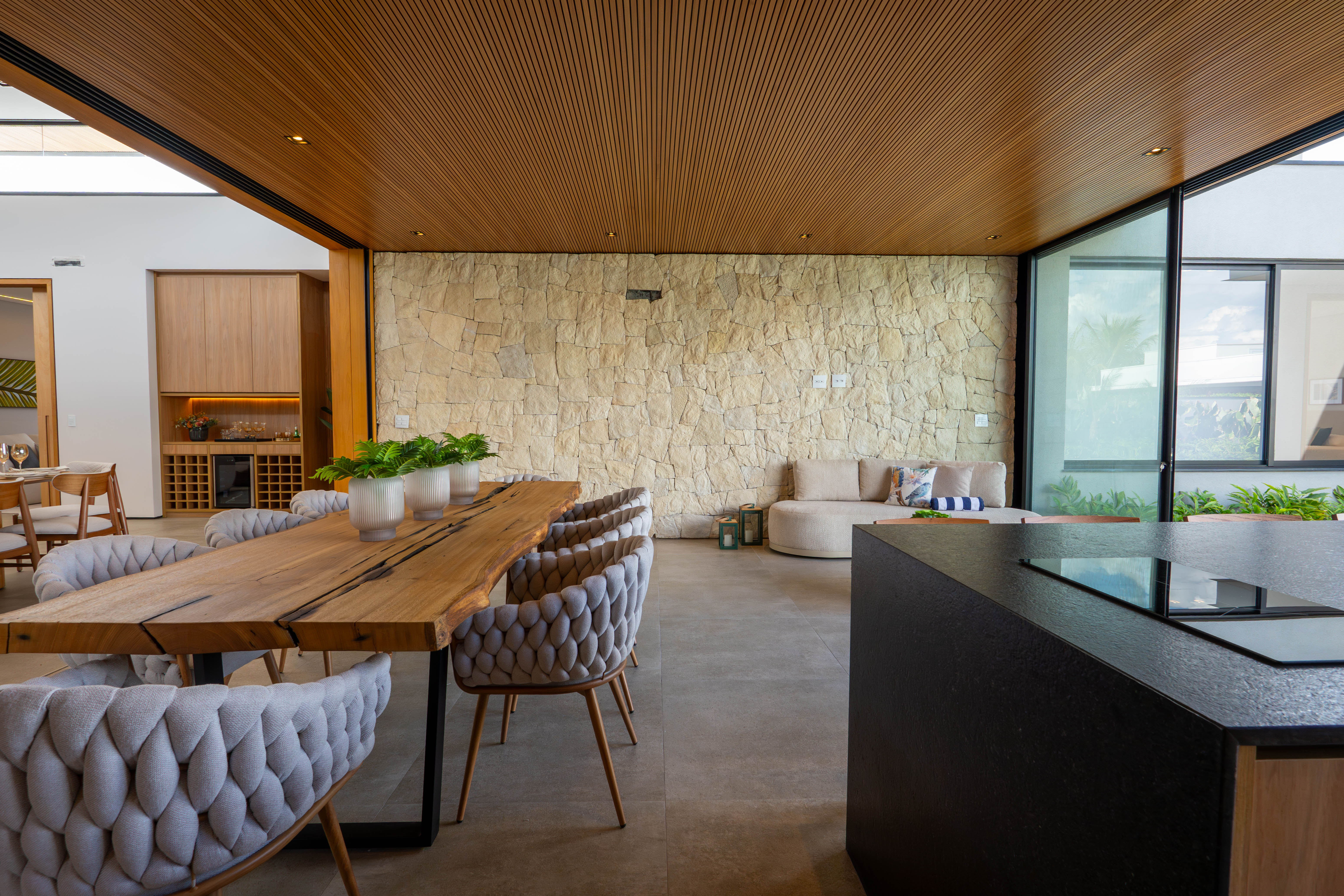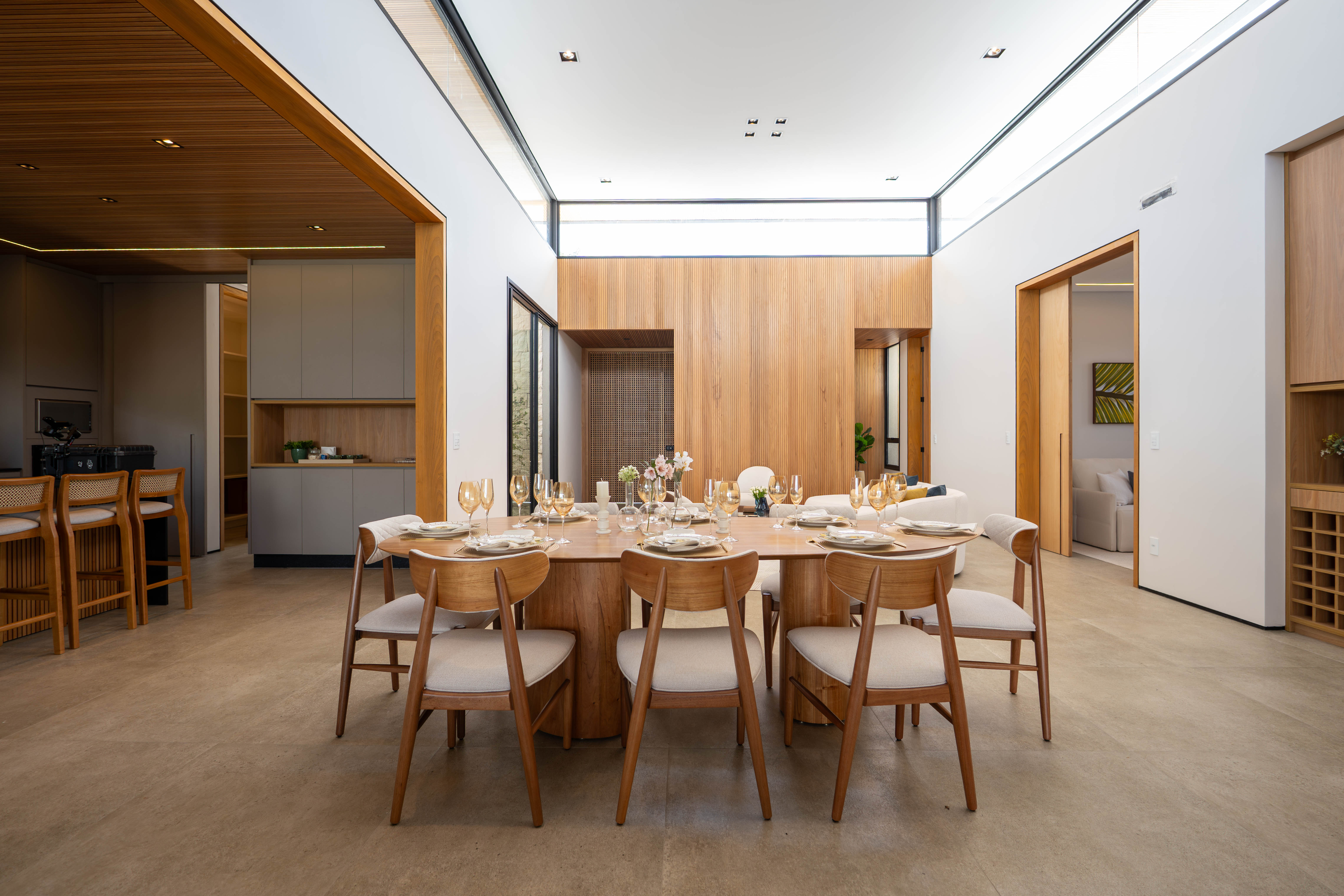 - Sala de estar integrada com sala de jantar, cozinha e jardim de inverno (planta jaboticabeira)
