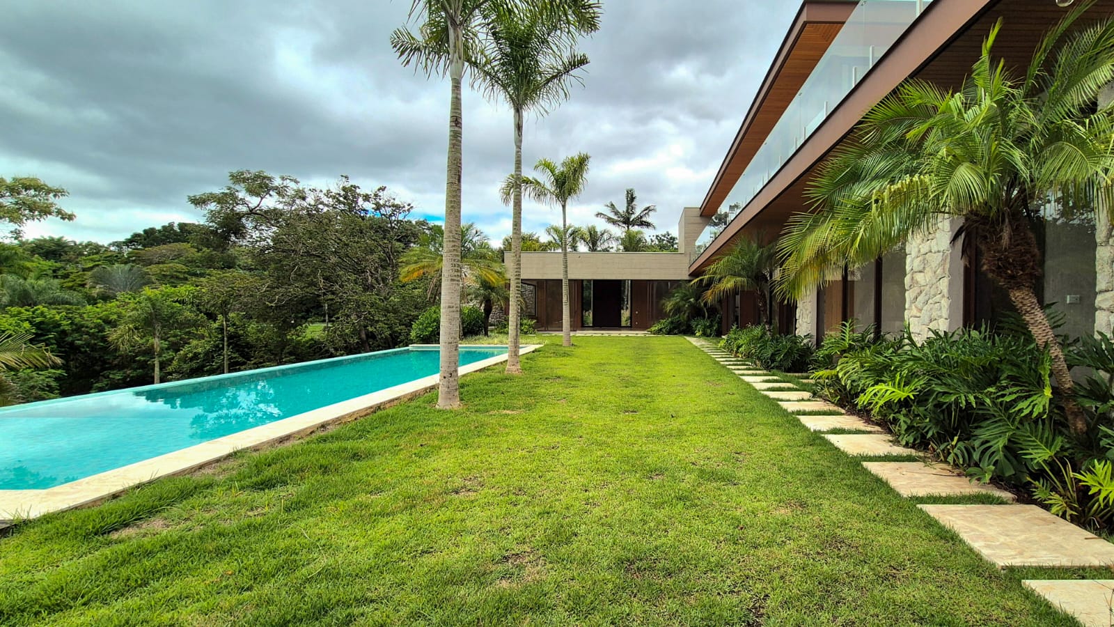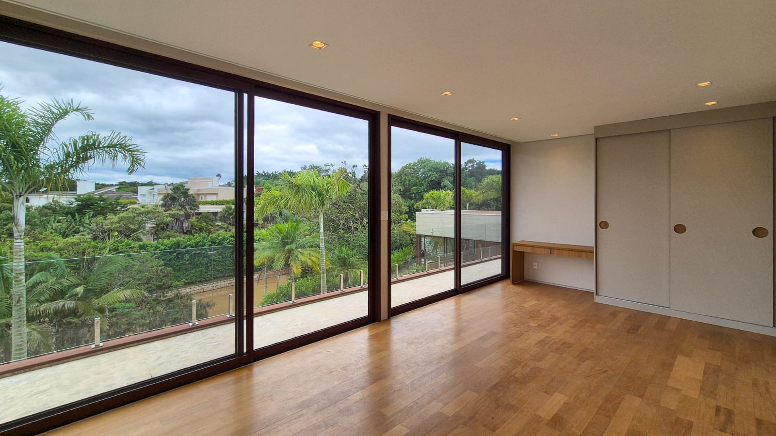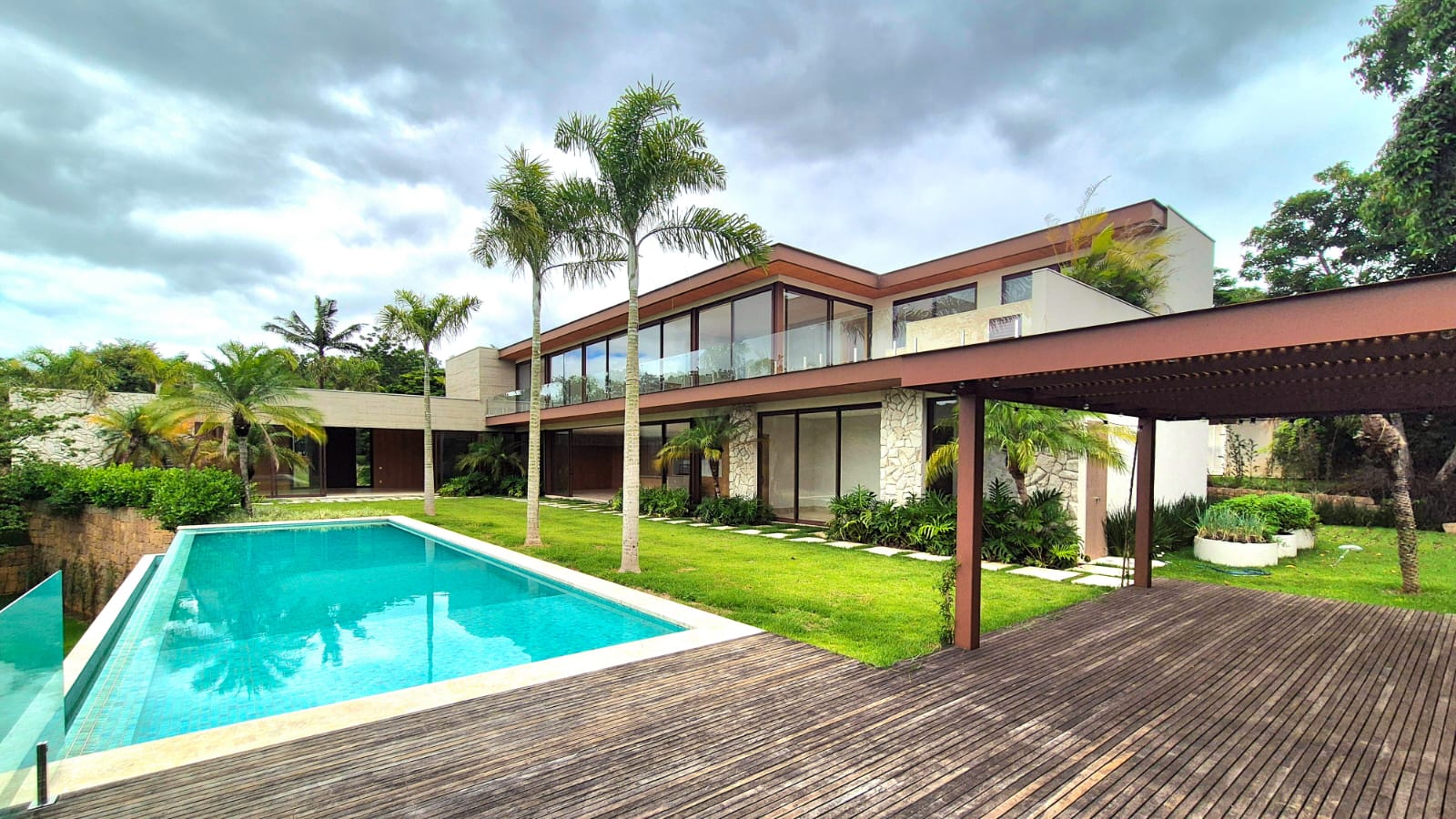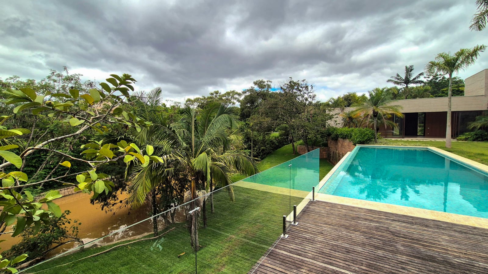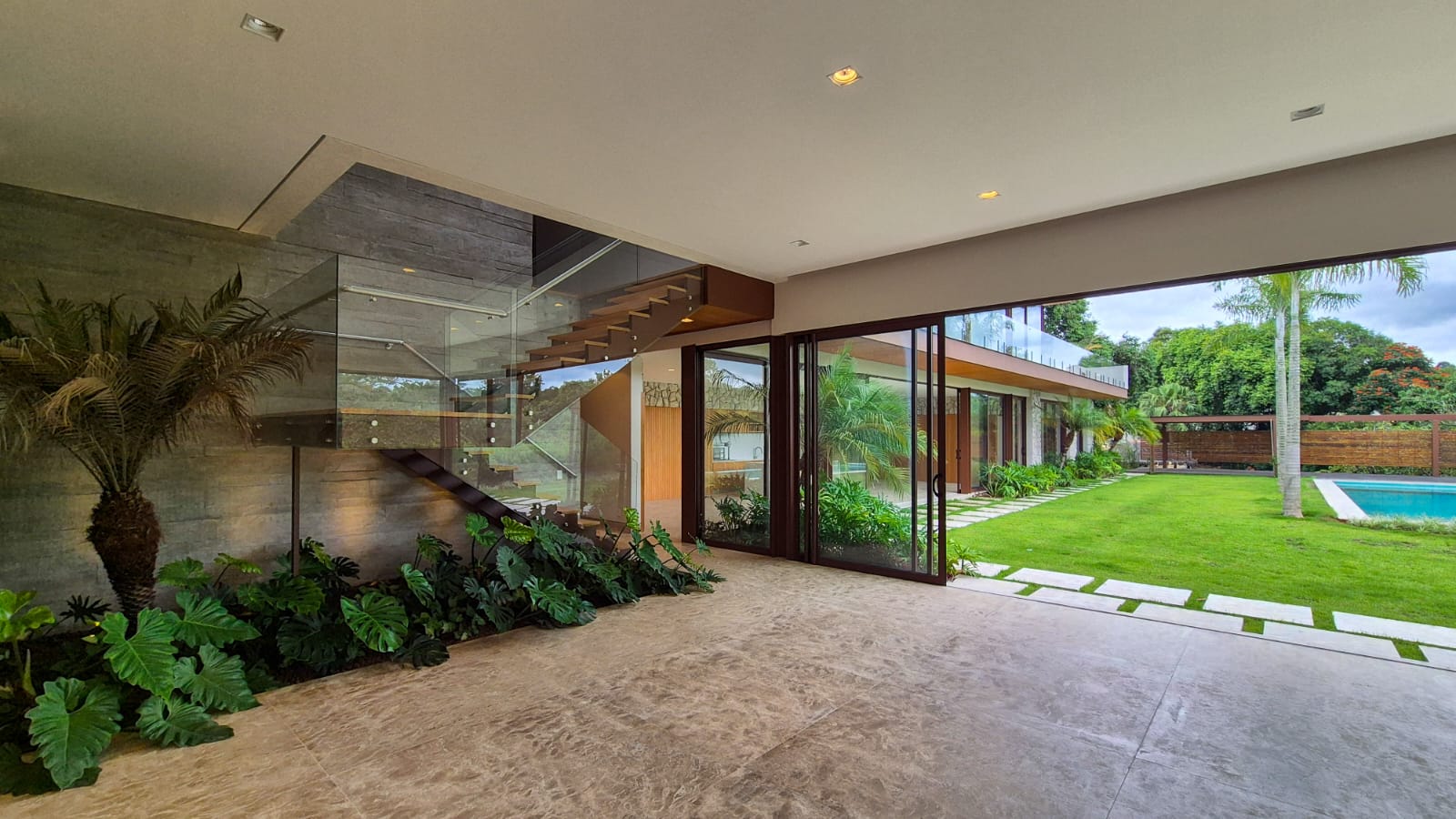 Residência implantada em posição privilegiada, com vista aberta para o lago e paisagismo consolidado. Projeto com pé-direito alto, integração com o jardim e lareira valorizando a área social.