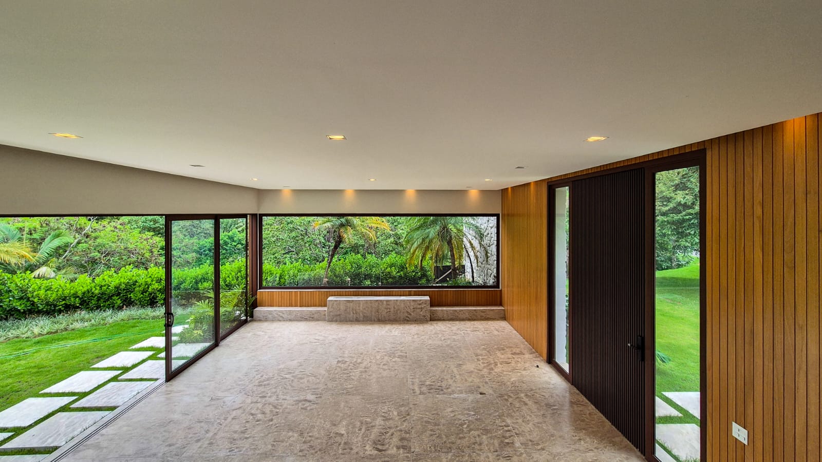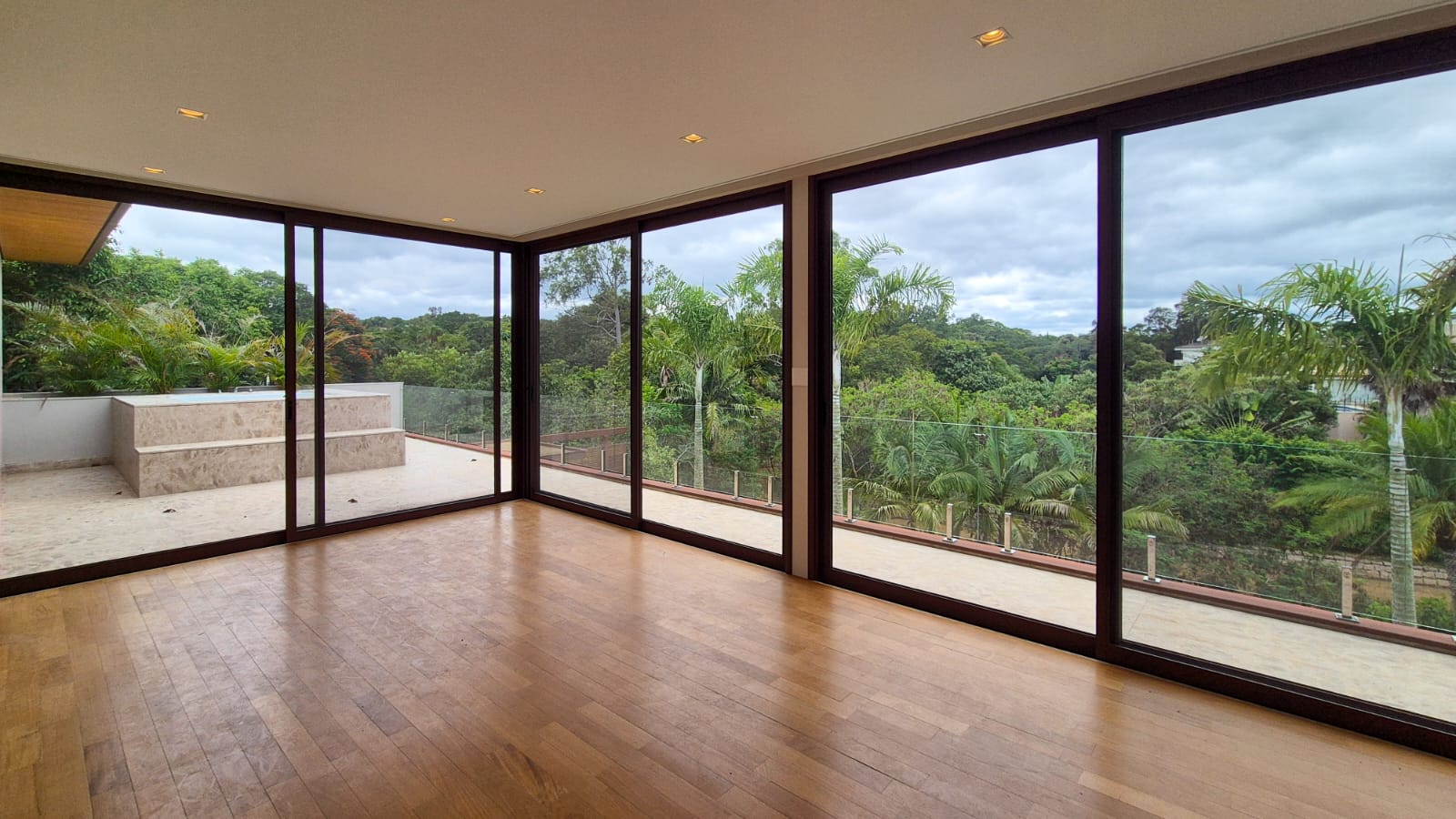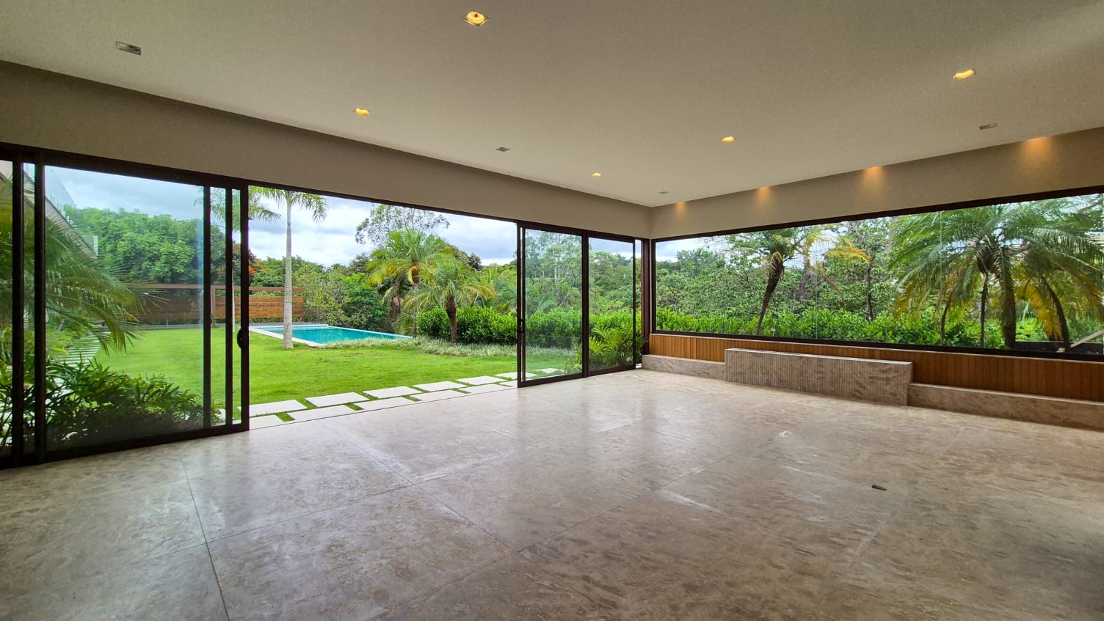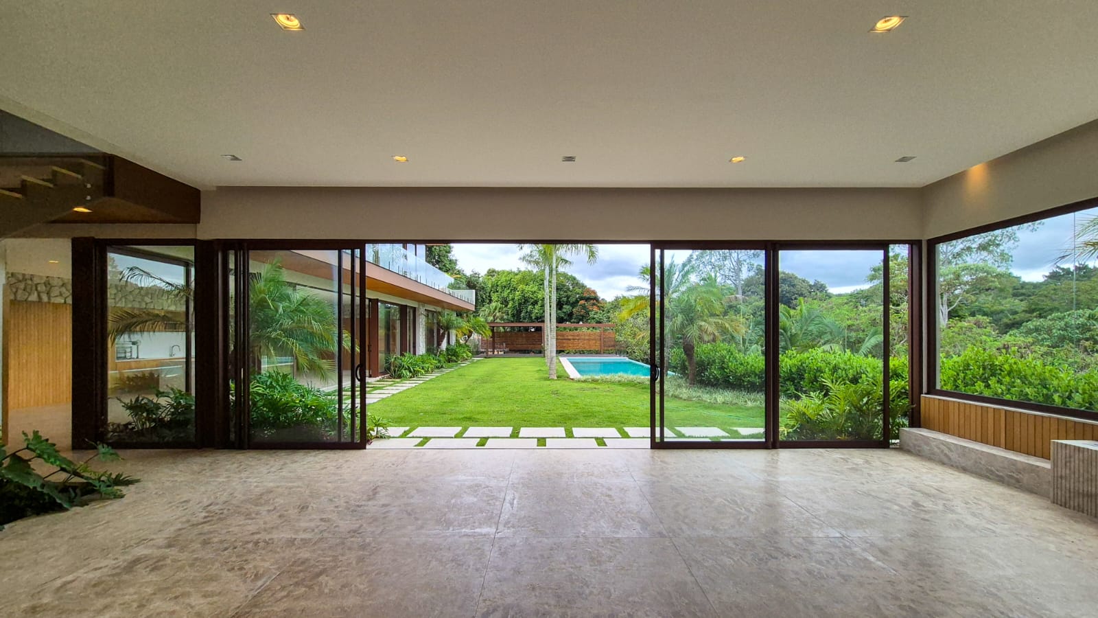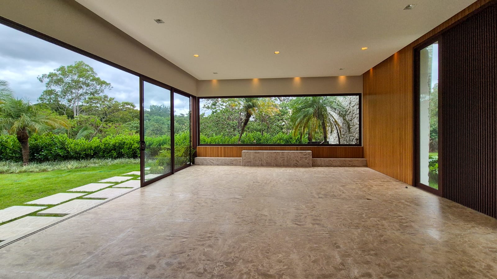 Residência implantada em posição privilegiada, com vista aberta para o lago e paisagismo consolidado. Projeto com pé-direito alto, integração com o jardim e lareira valorizando a área social.