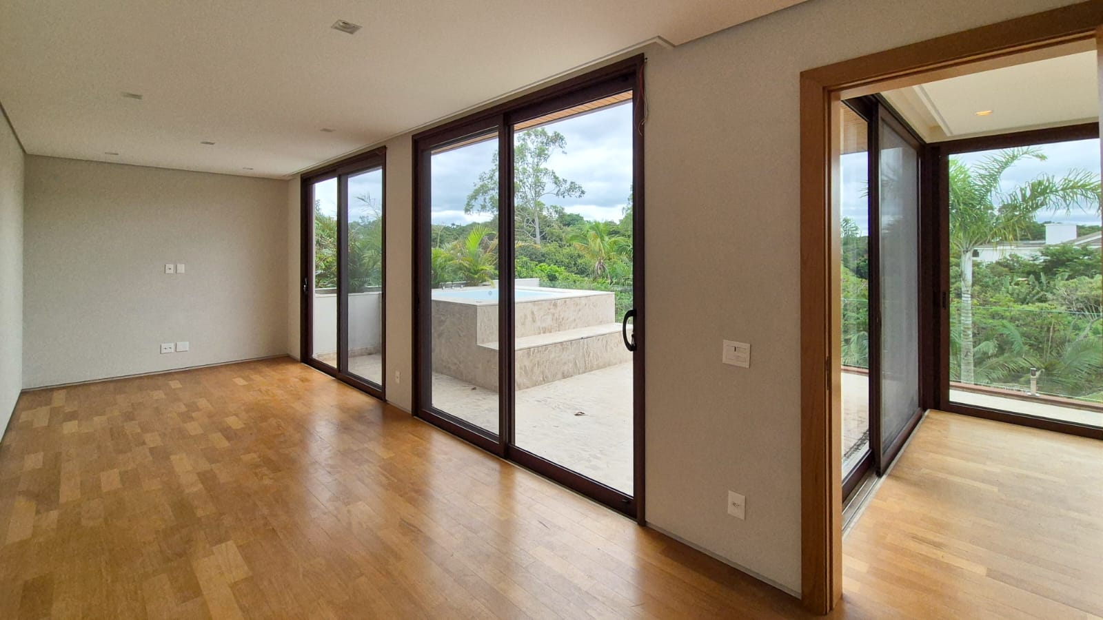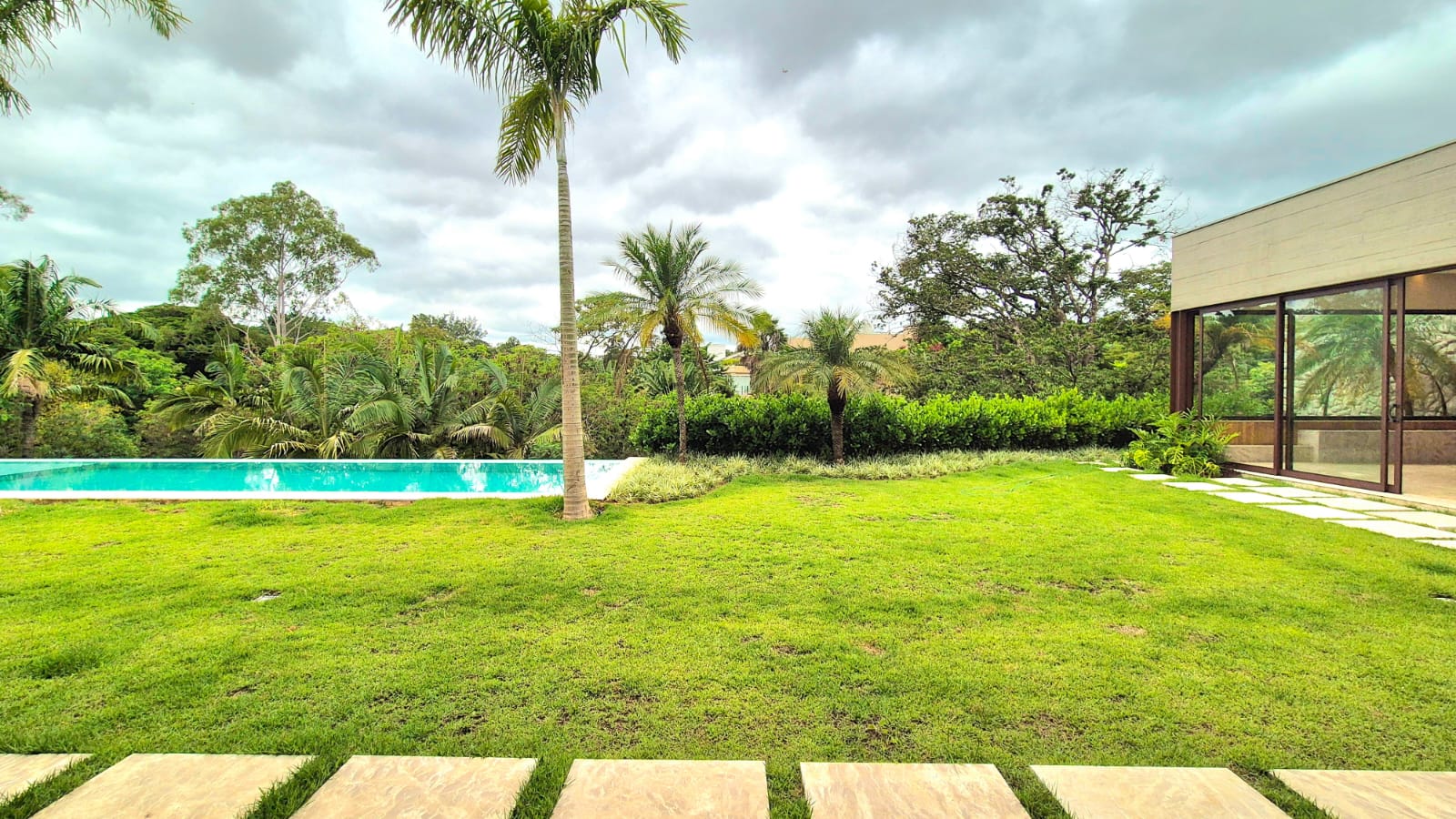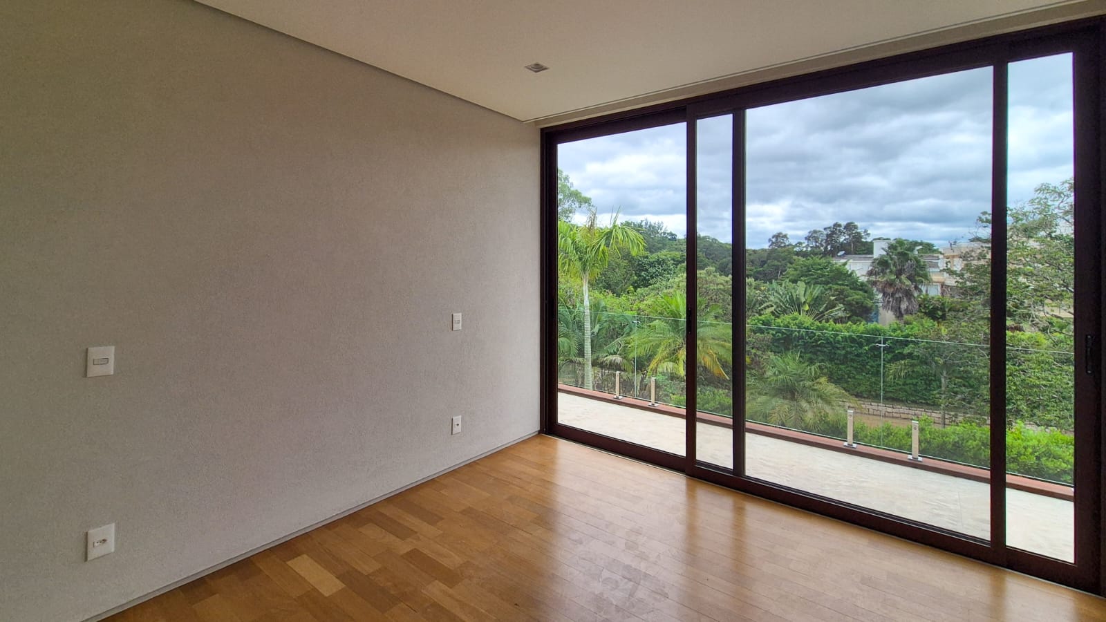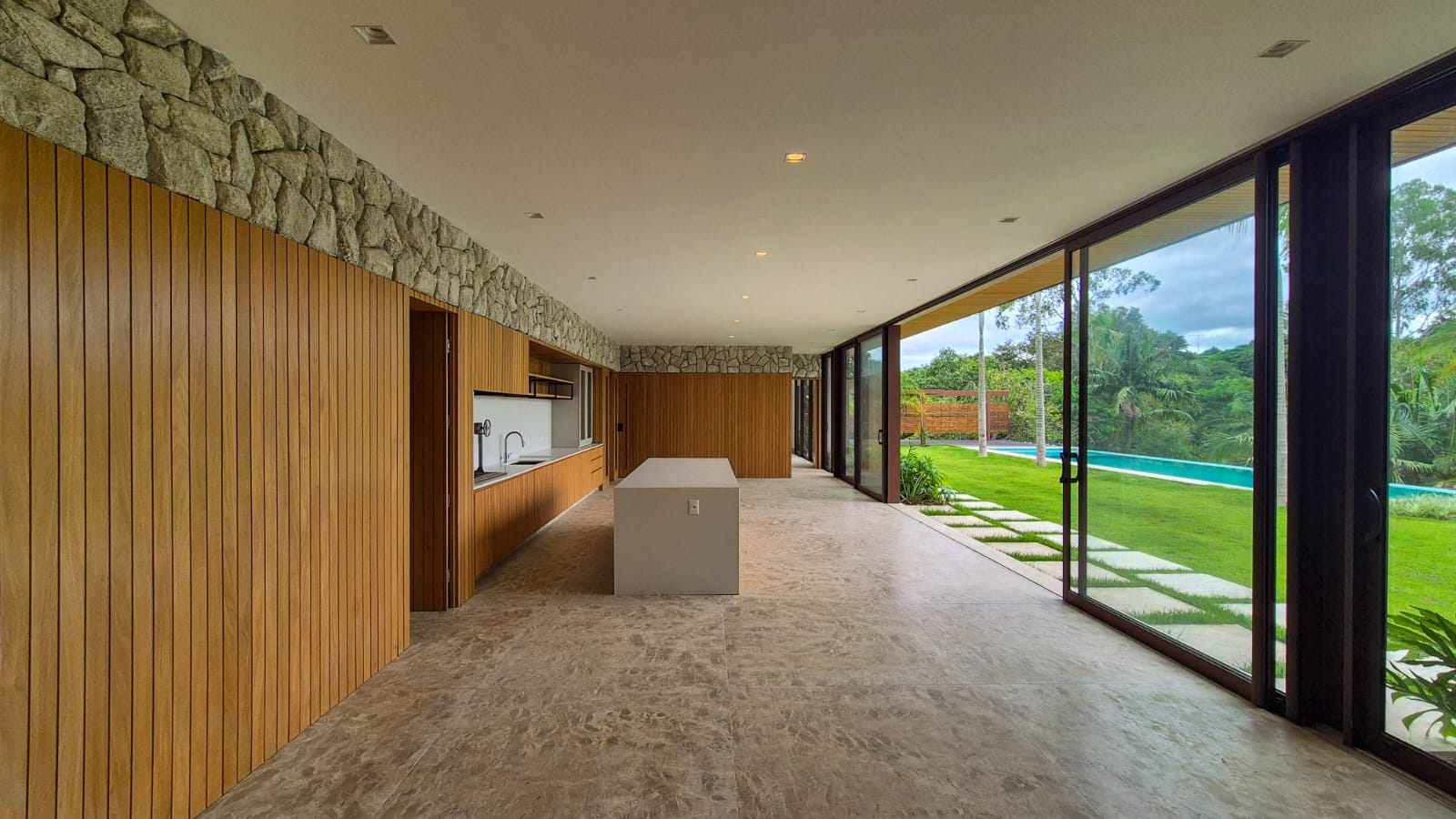 Residência implantada em posição privilegiada, com vista aberta para o lago e paisagismo consolidado. Projeto com pé-direito alto, integração com o jardim e lareira valorizando a área social.