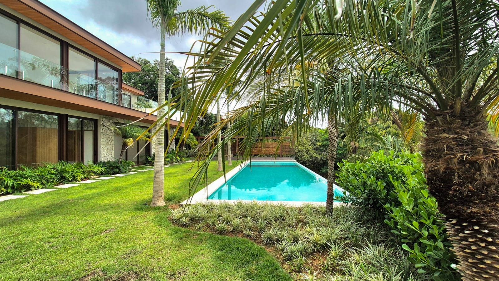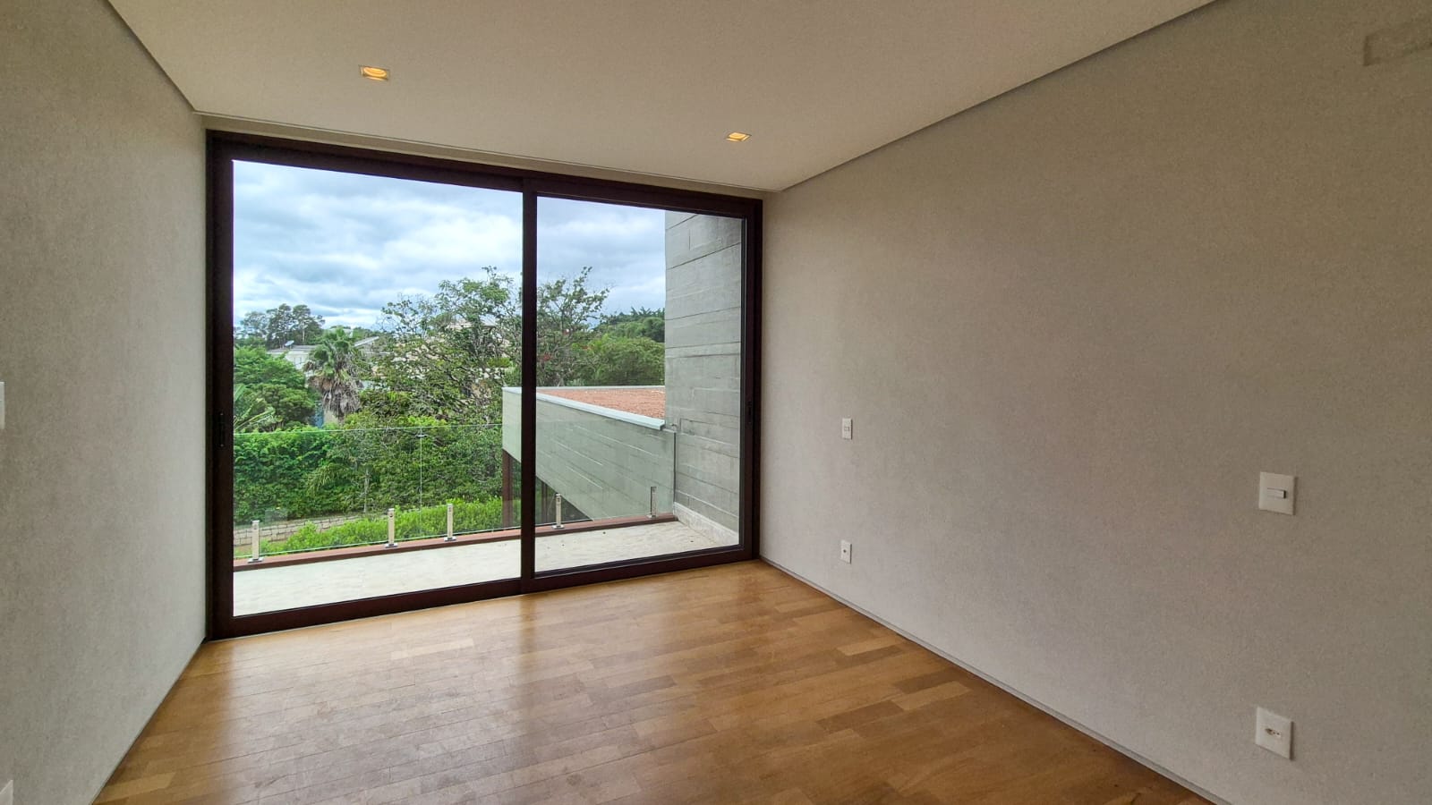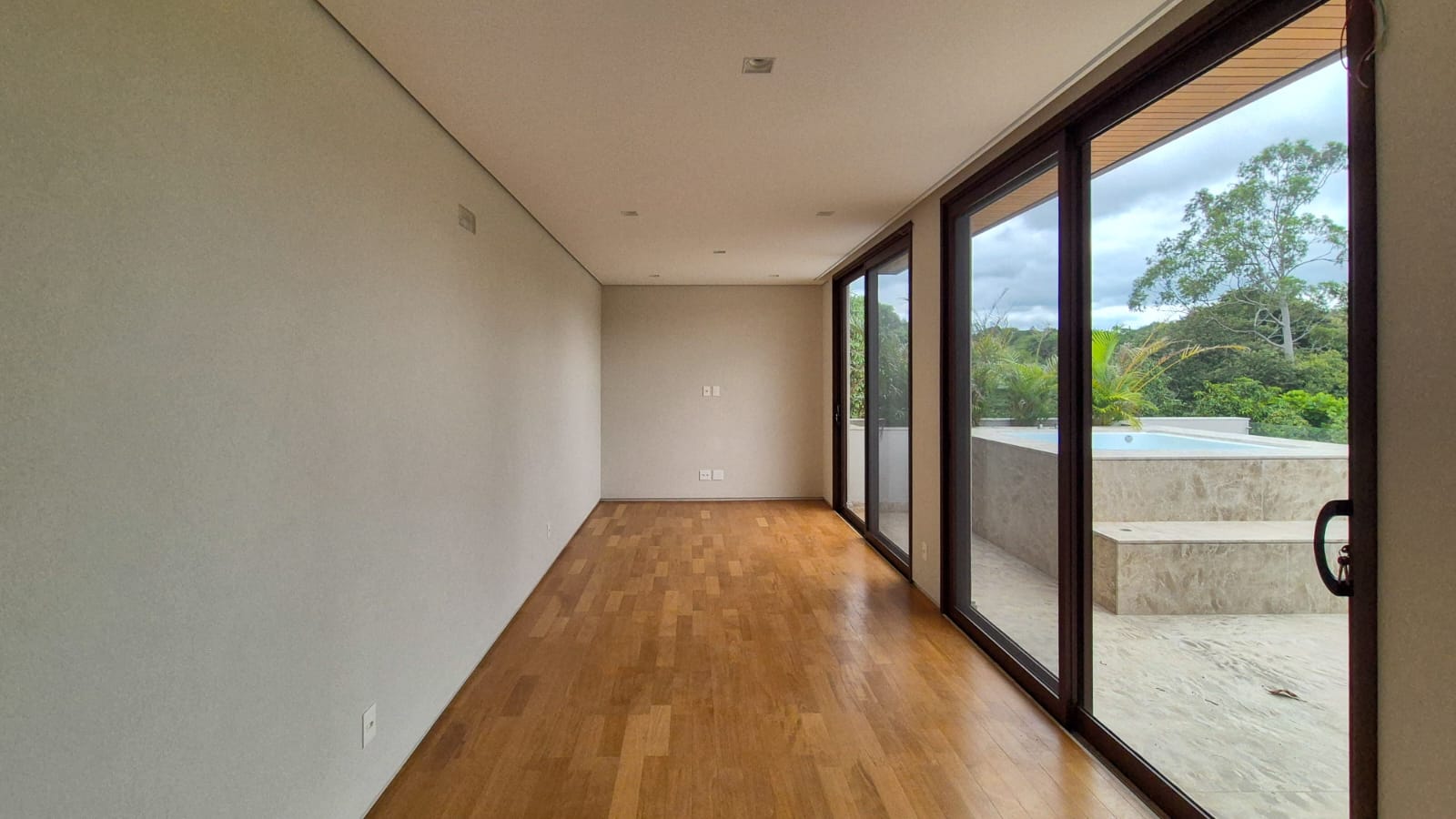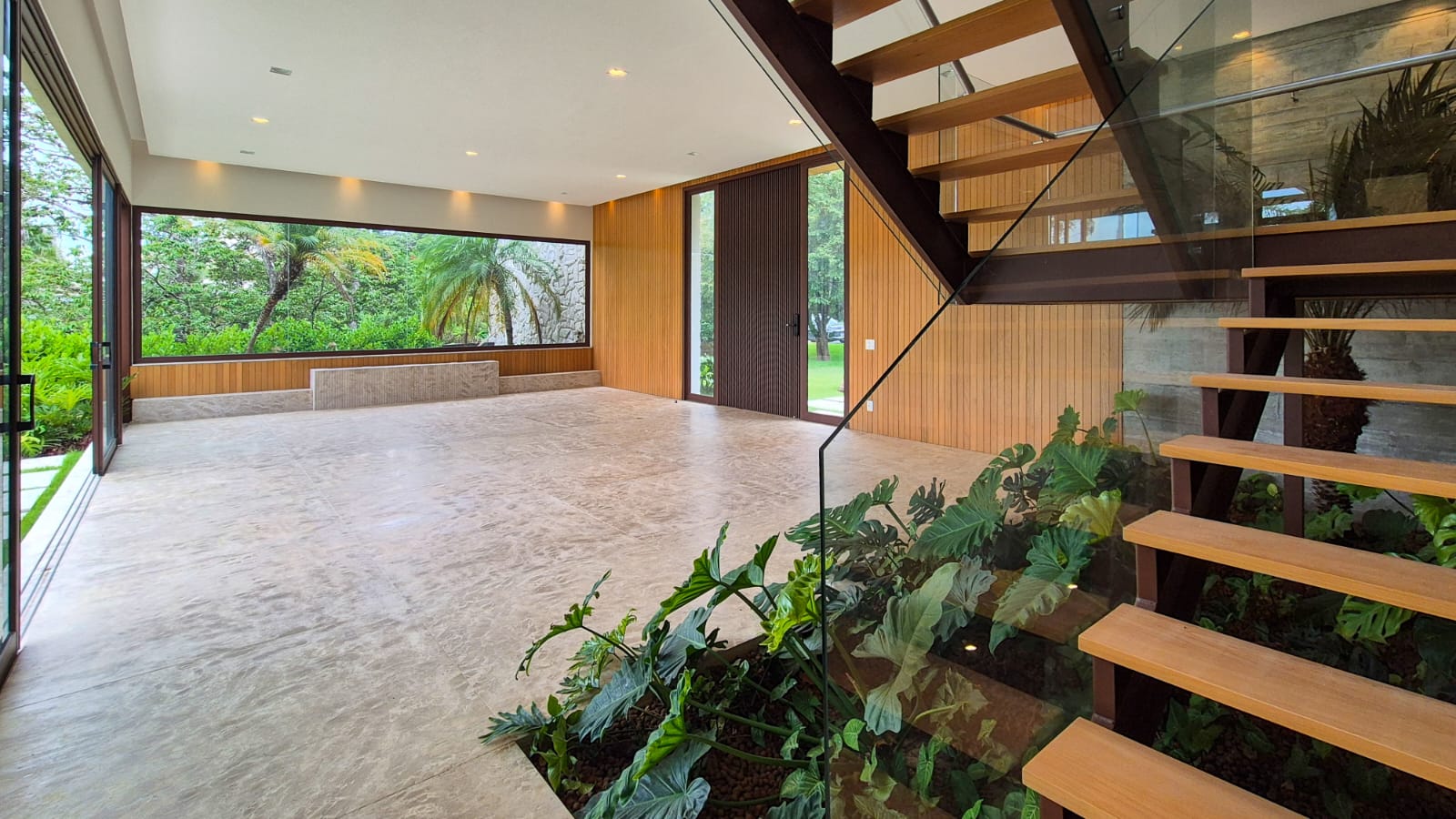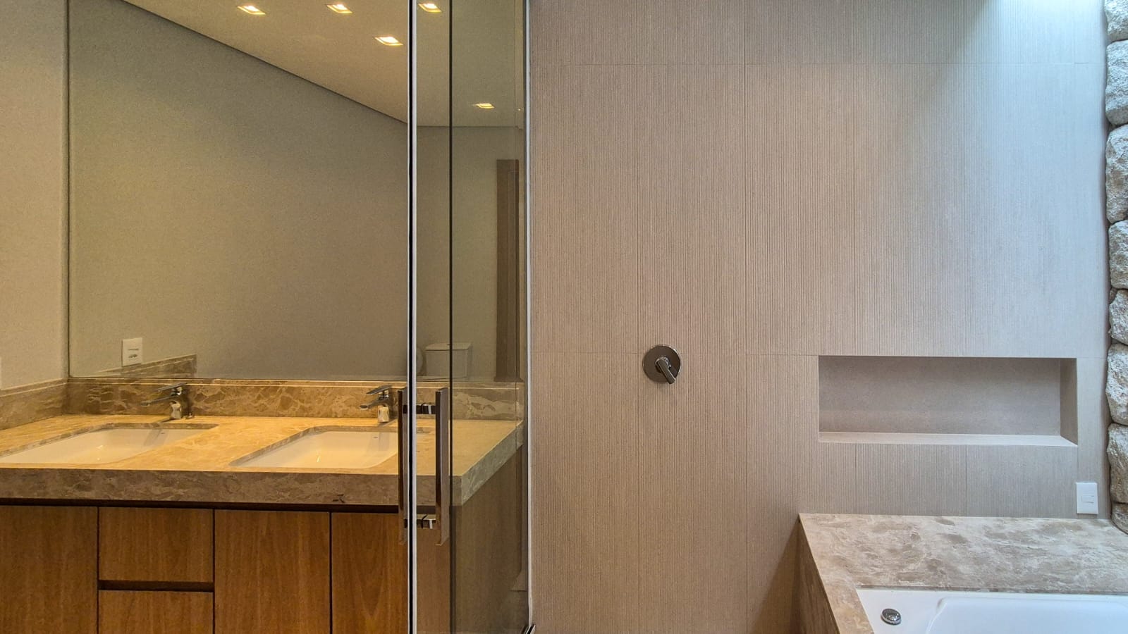 Residência implantada em posição privilegiada, com vista aberta para o lago e paisagismo consolidado. Projeto com pé-direito alto, integração com o jardim e lareira valorizando a área social.