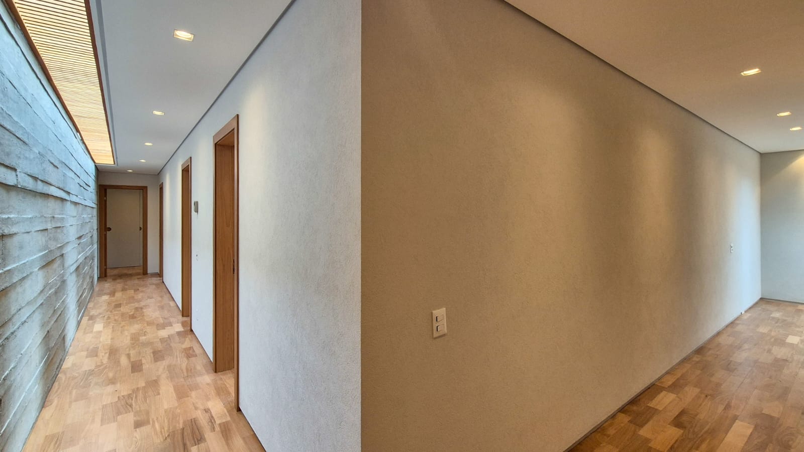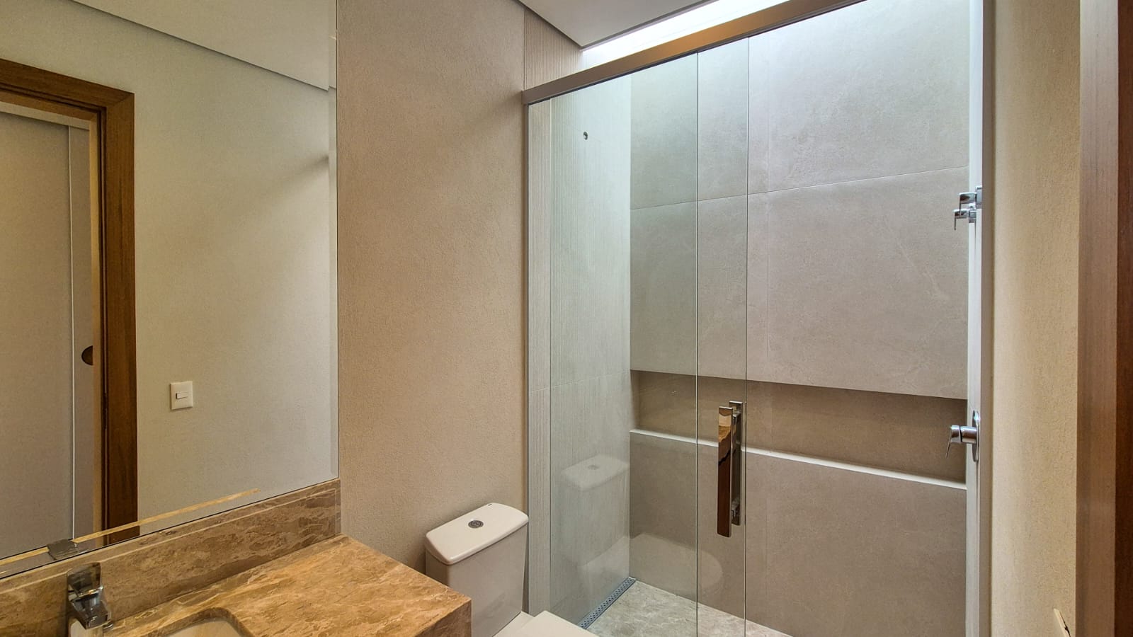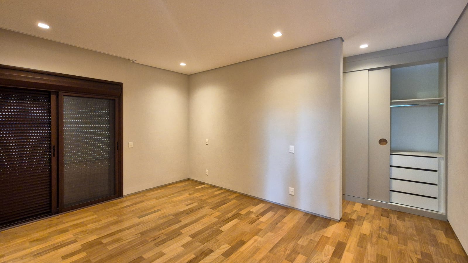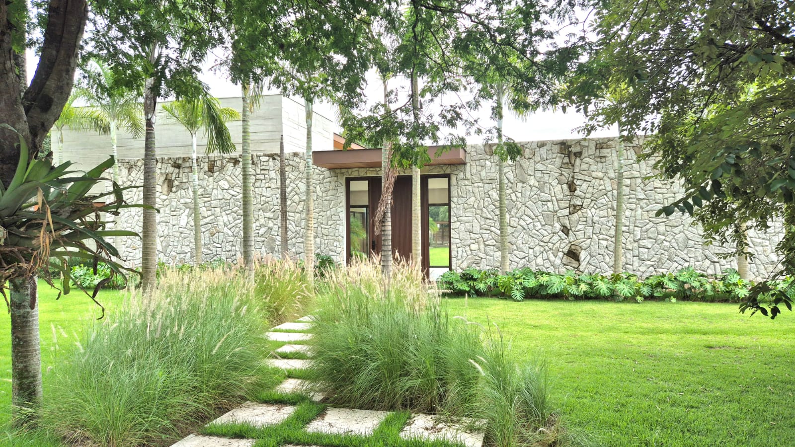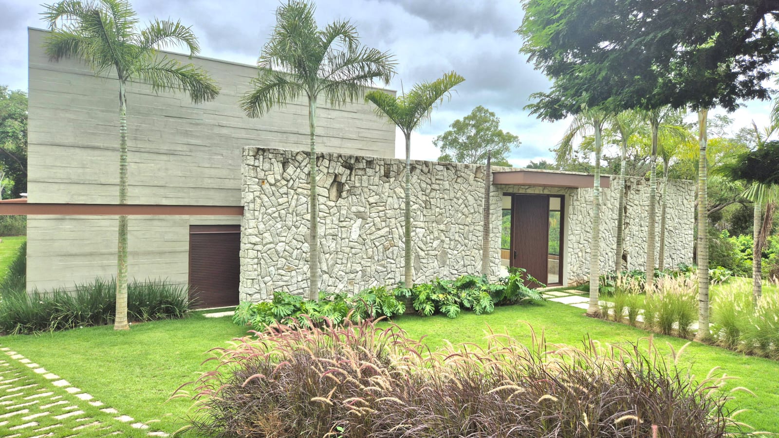 Residência implantada em posição privilegiada, com vista aberta para o lago e paisagismo consolidado. Projeto com pé-direito alto, integração com o jardim e lareira valorizando a área social.