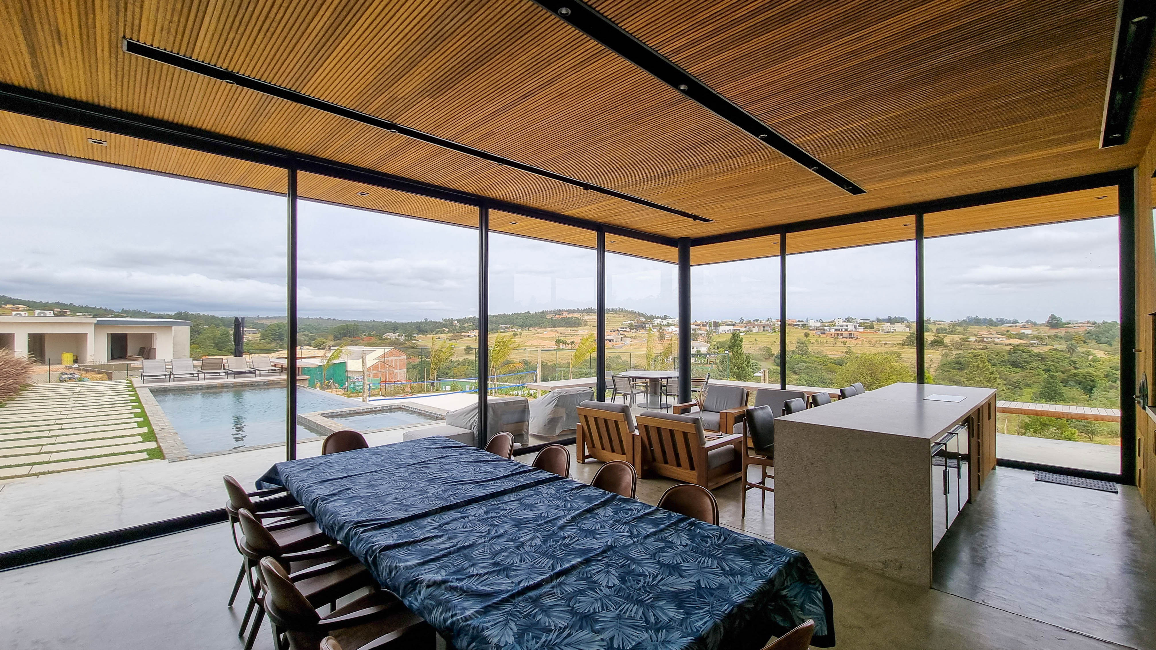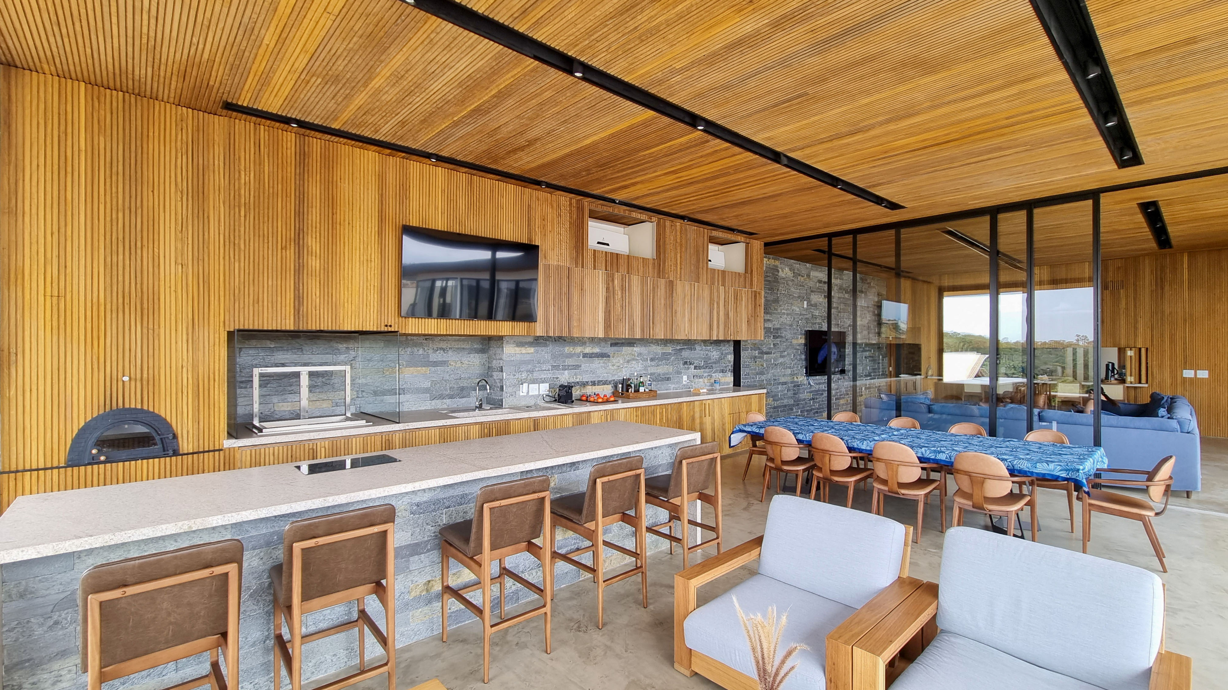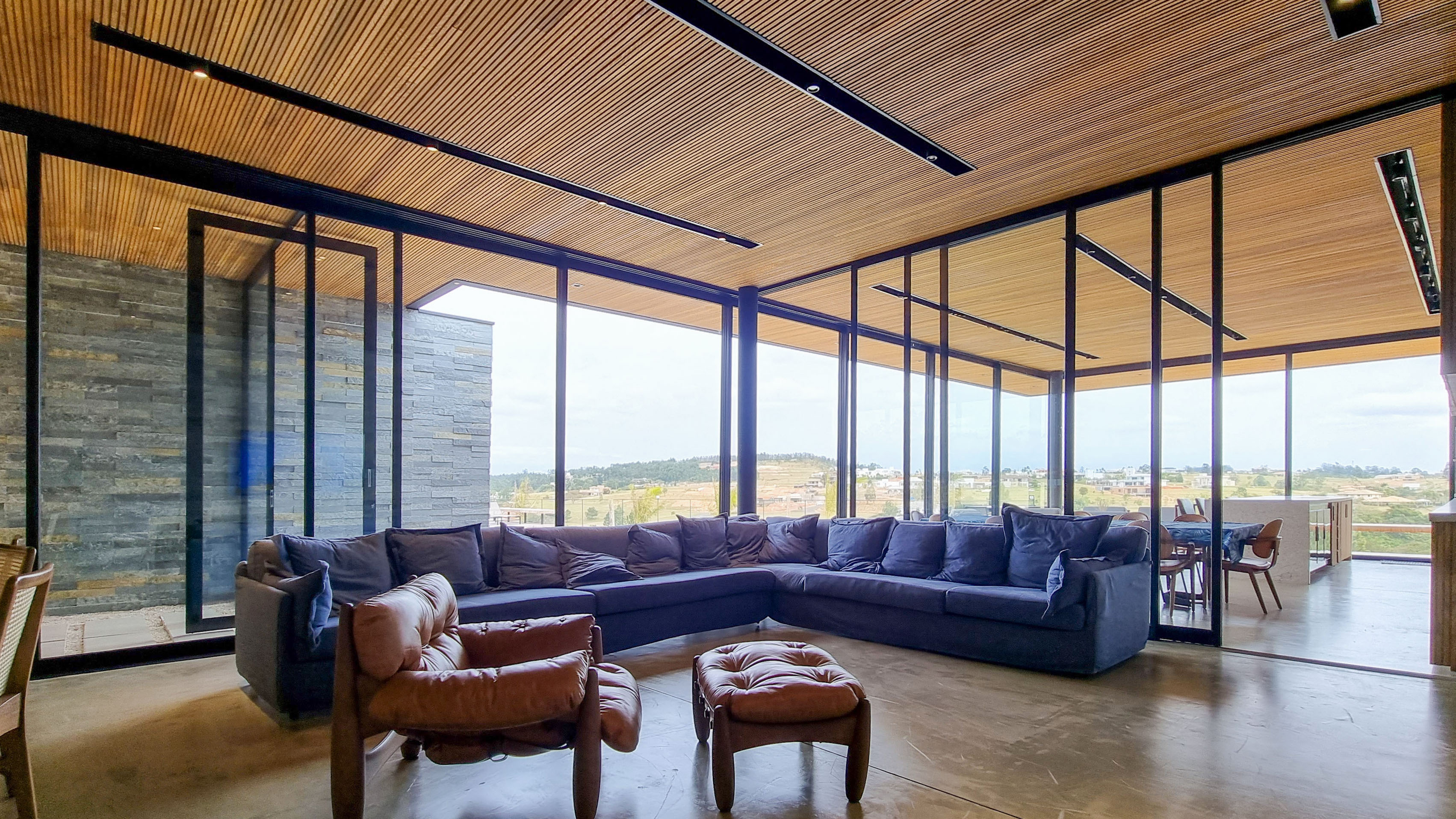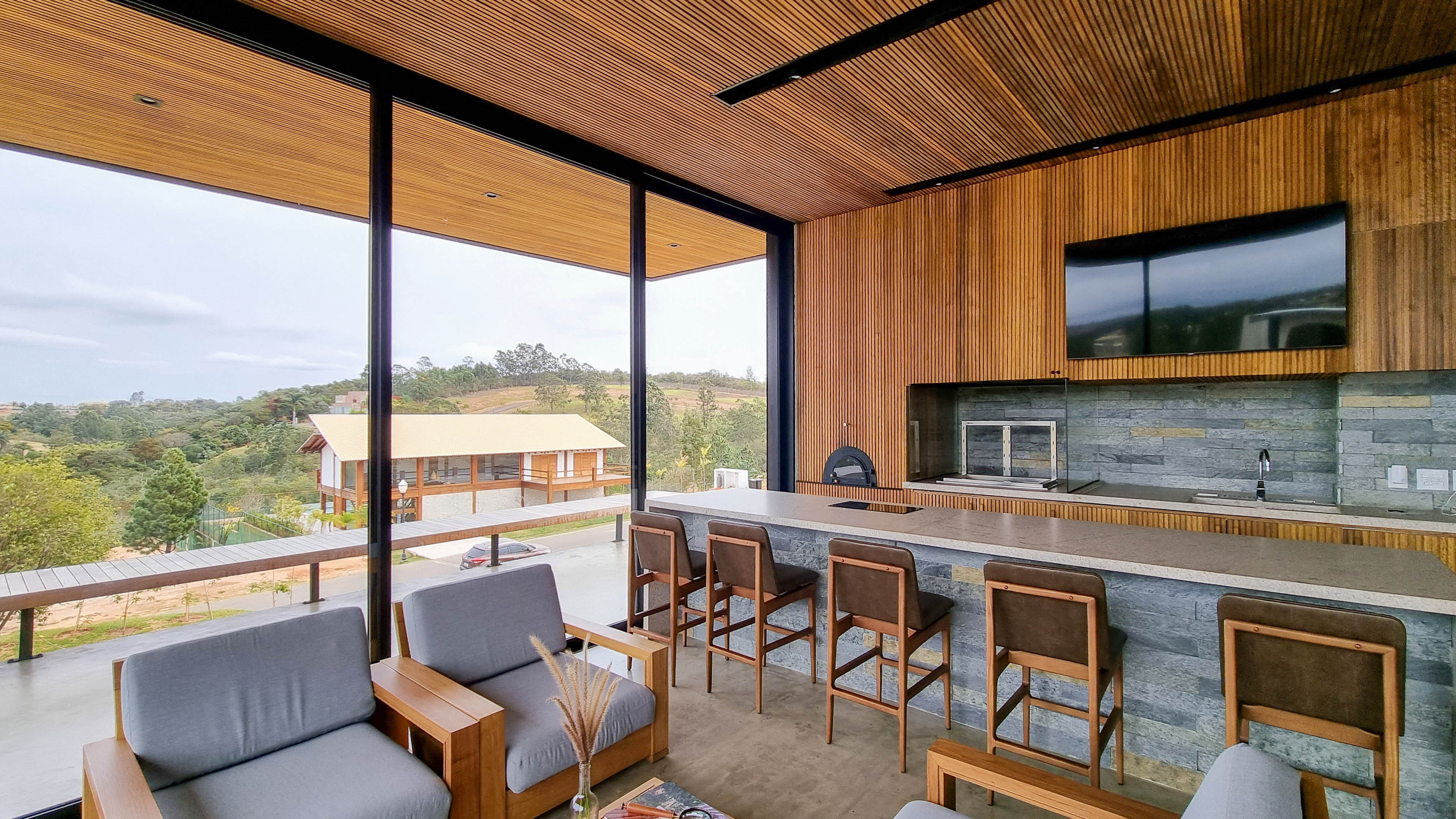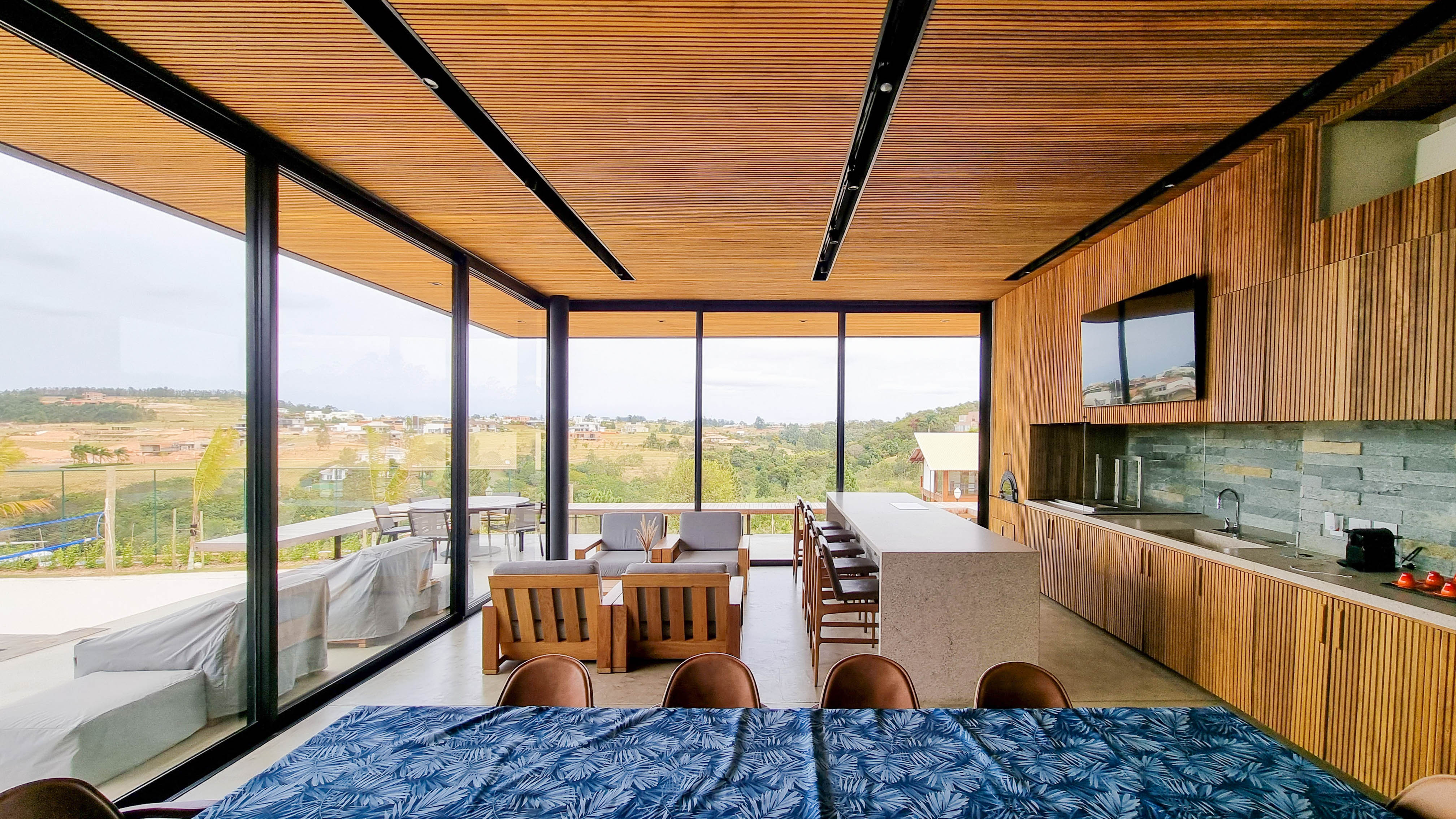 Um projeto onde a integração vai além de privilegiar a comunhão dos ambientes. Ele também entrega belas vistas de vários pontos devido à quantidade de vidros, outros elementos contemporâneos e minimalistas, como madeira, pedra e estrutura metálica, que imprimem modernidade e fazem com que tudo se conecte perfeitamente nesta casa.