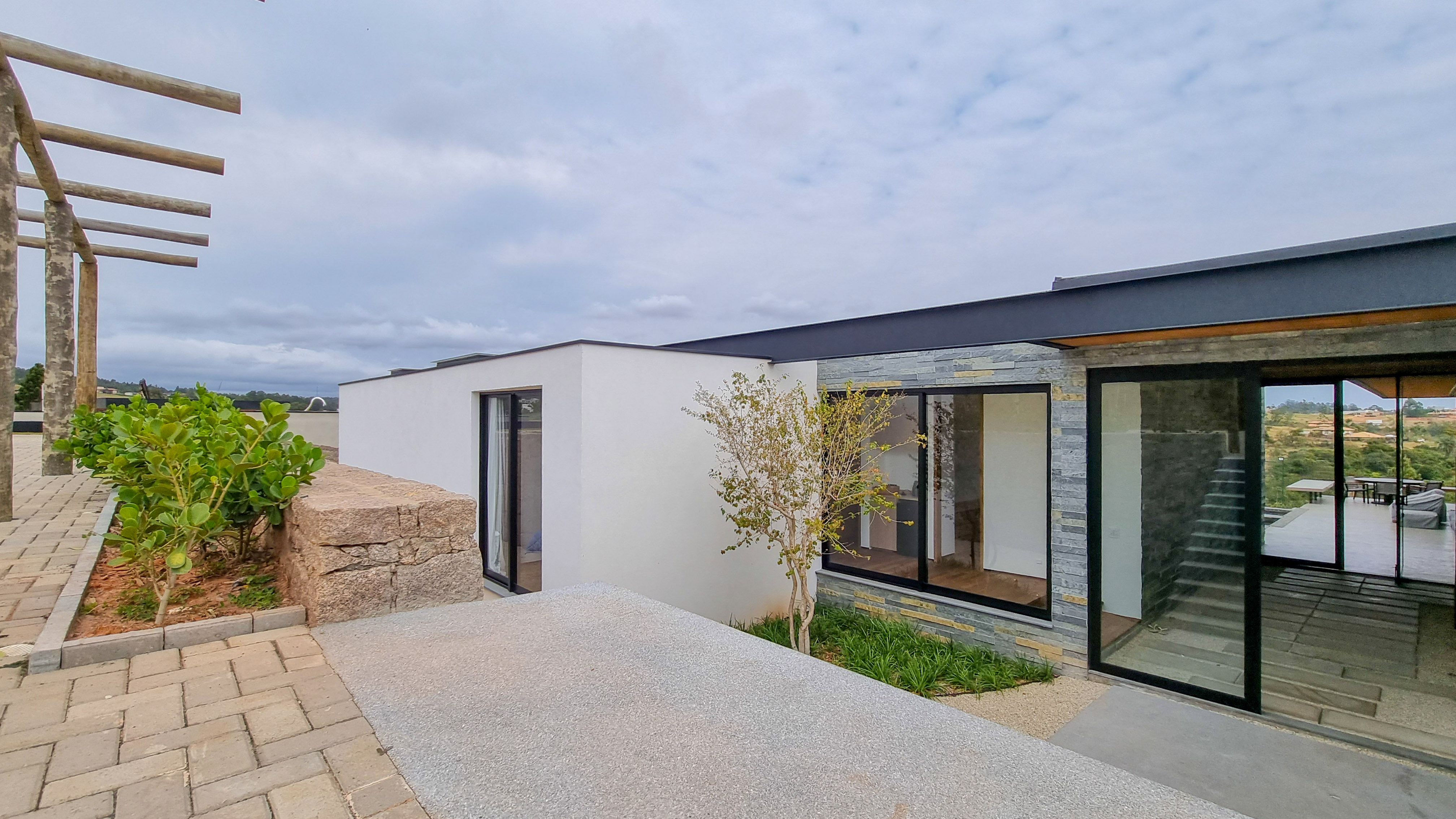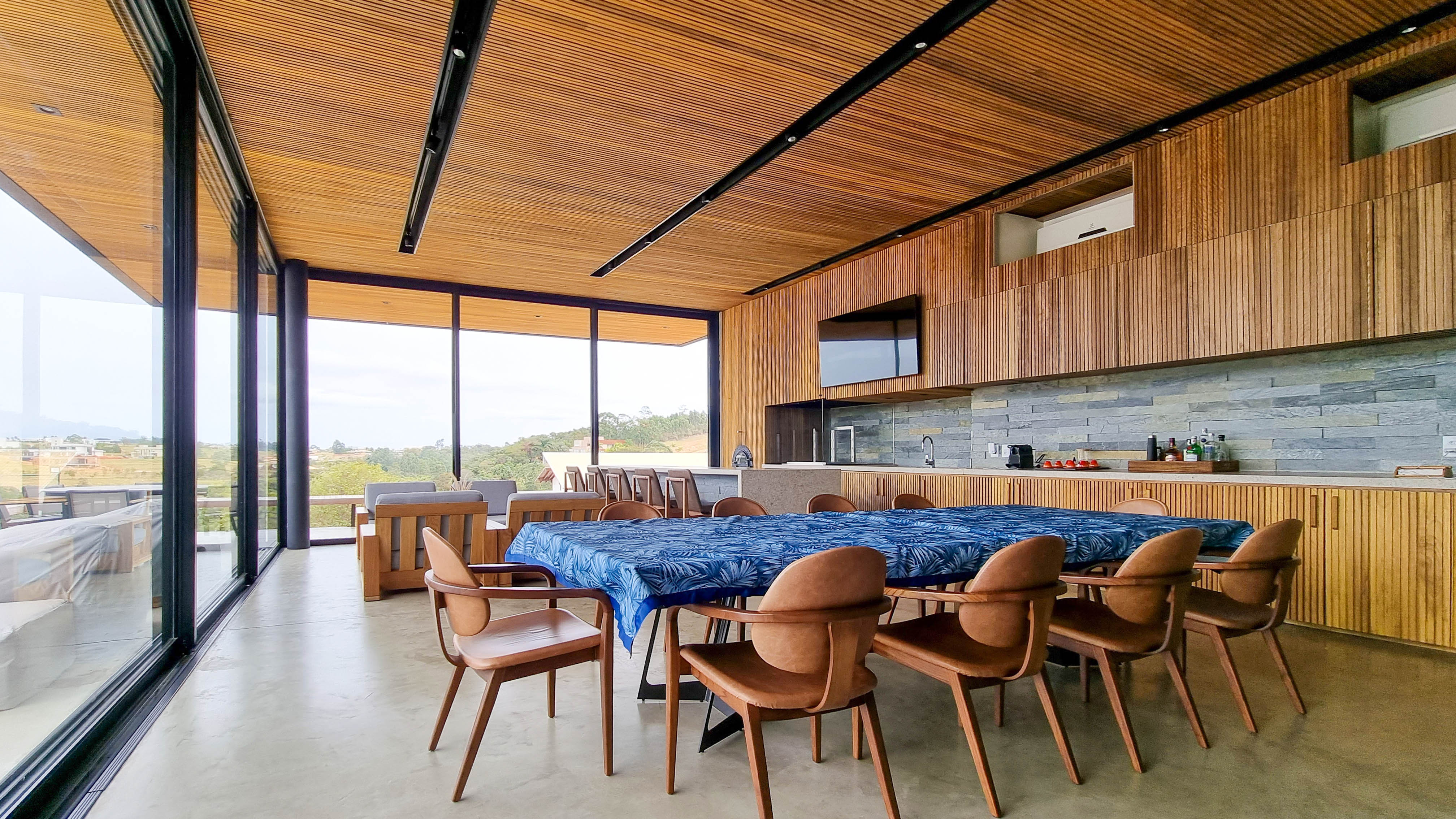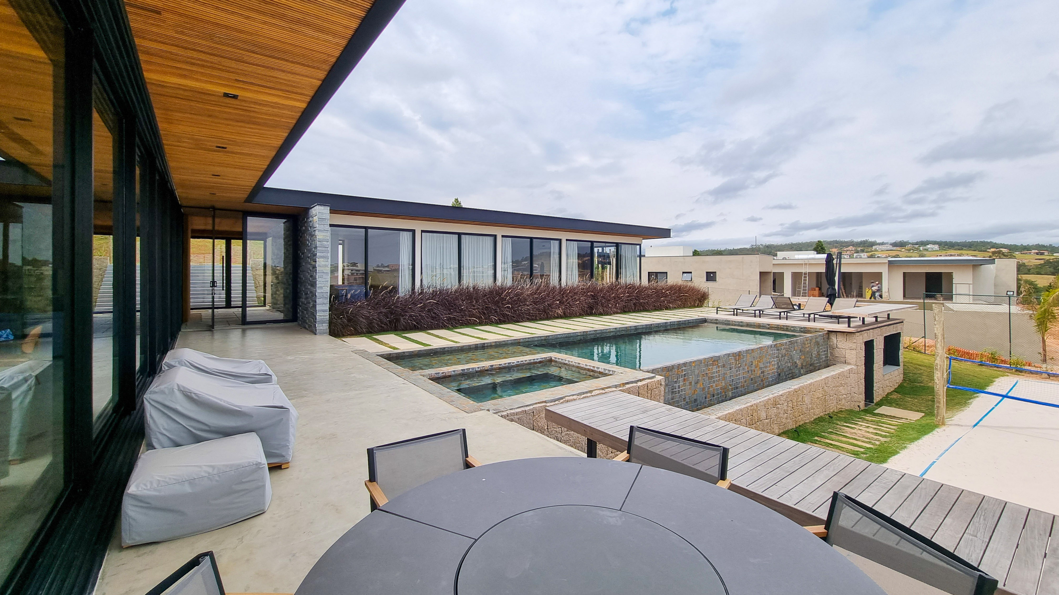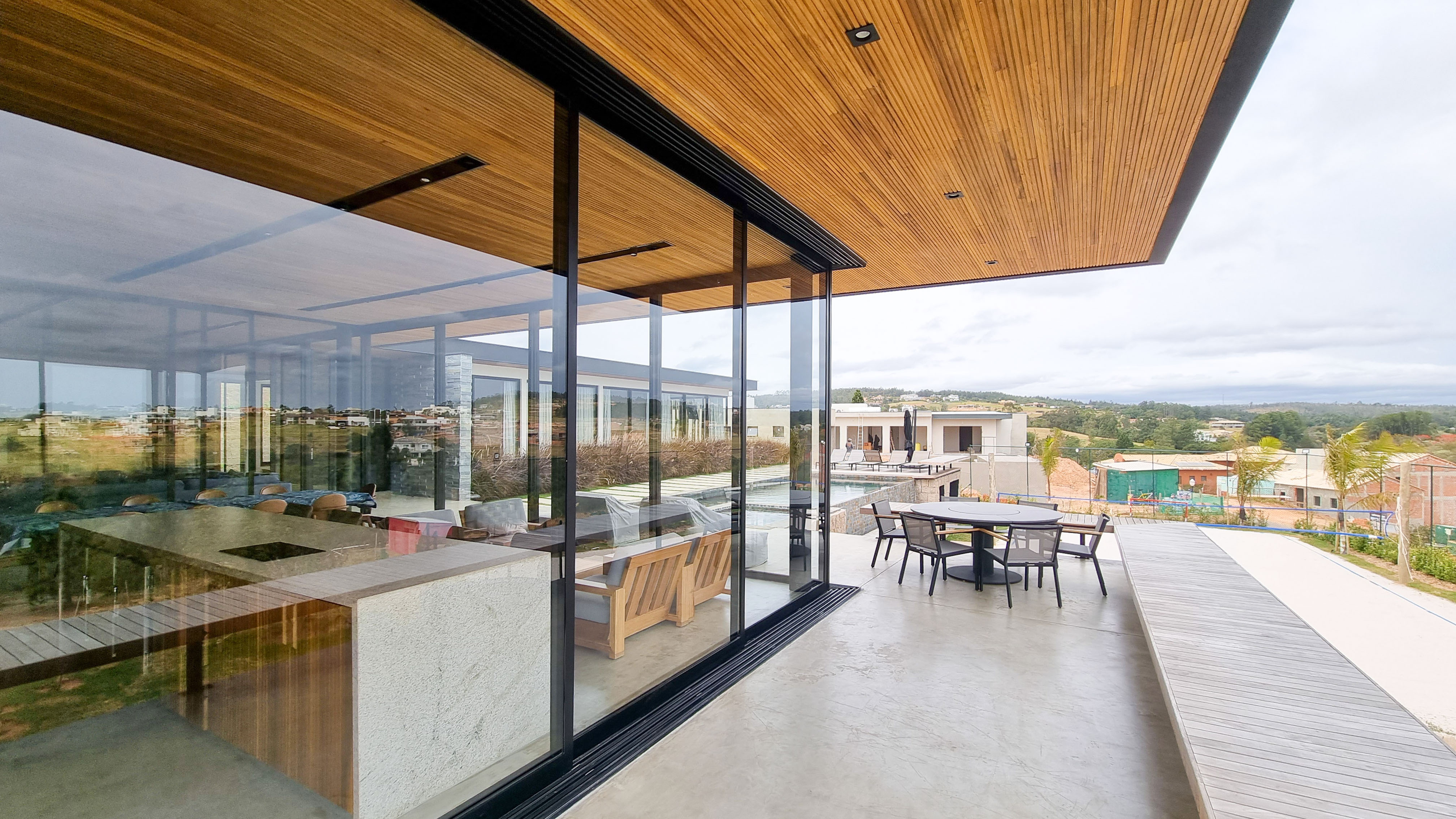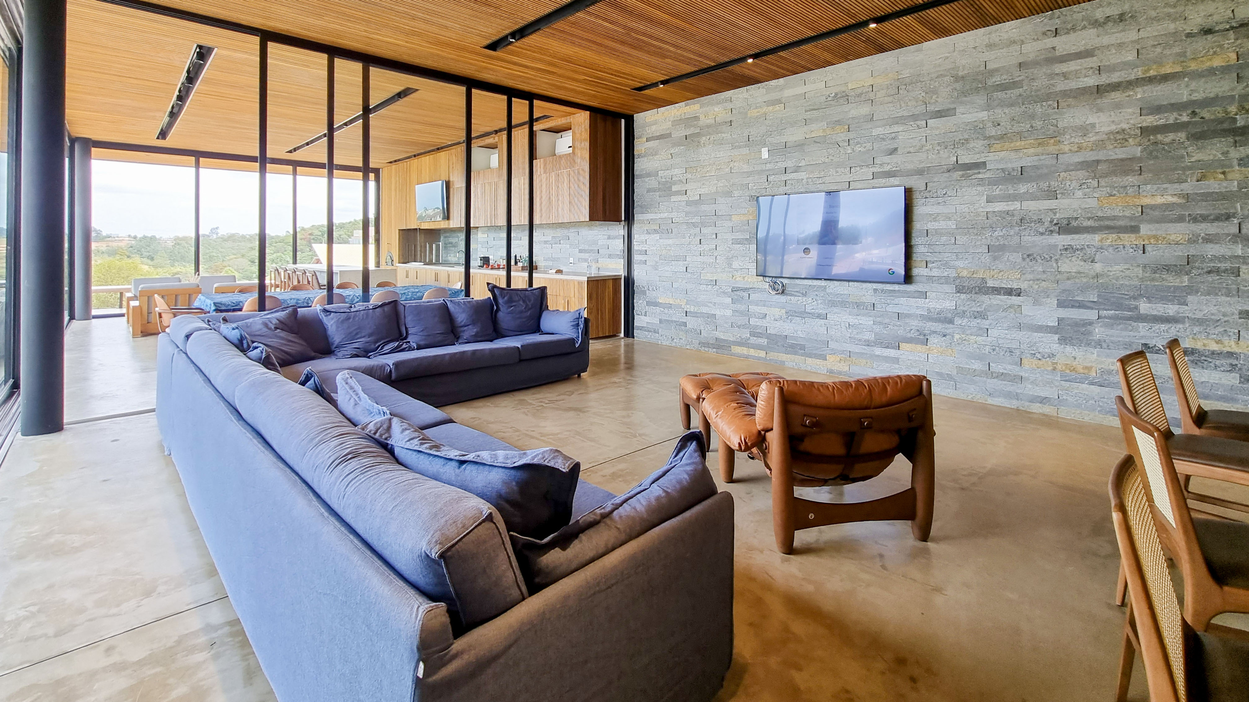 Um projeto onde a integração vai além de privilegiar a comunhão dos ambientes. Ele também entrega belas vistas de vários pontos devido à quantidade de vidros, outros elementos contemporâneos e minimalistas, como madeira, pedra e estrutura metálica, que imprimem modernidade e fazem com que tudo se conecte perfeitamente nesta casa.