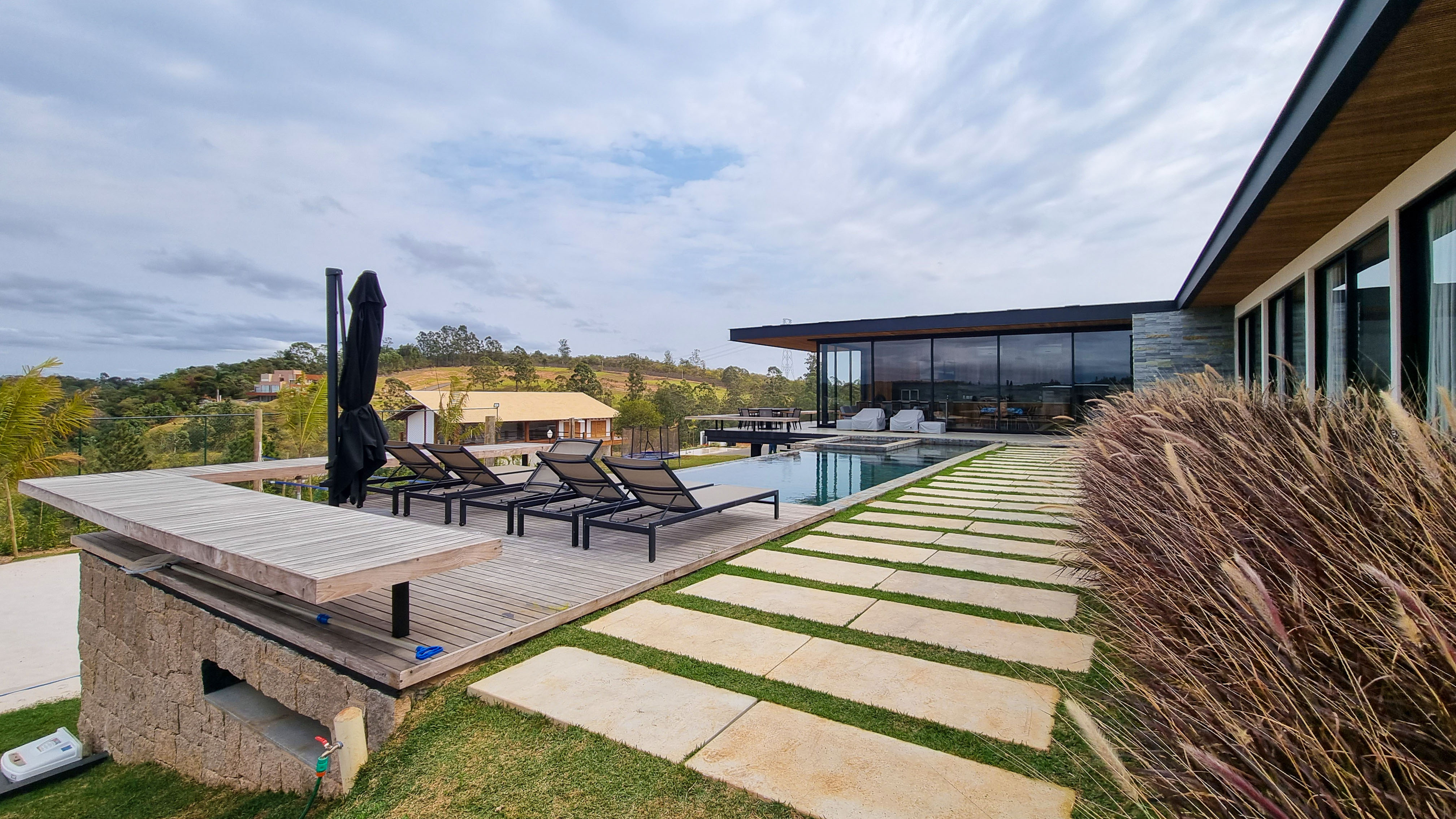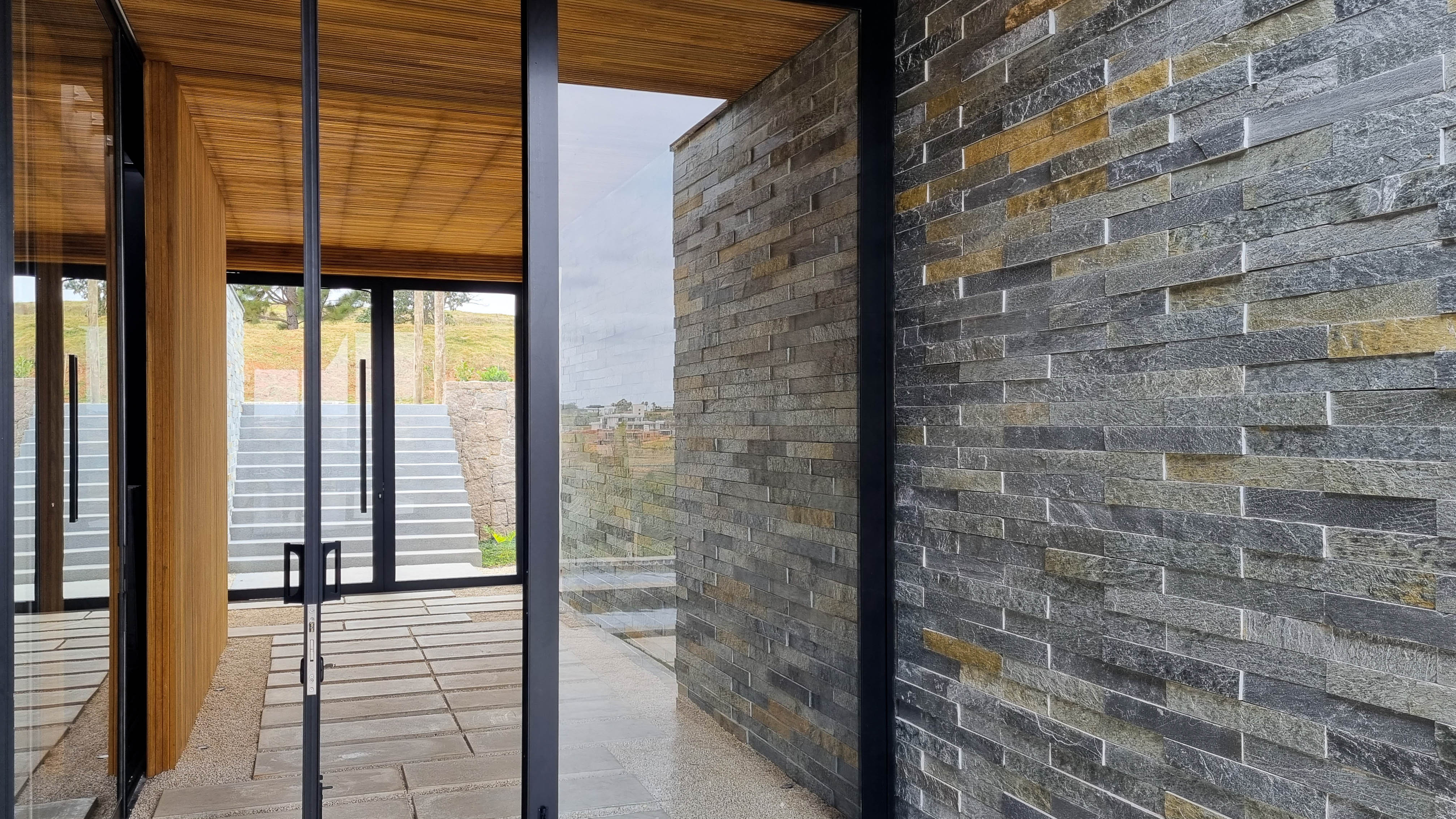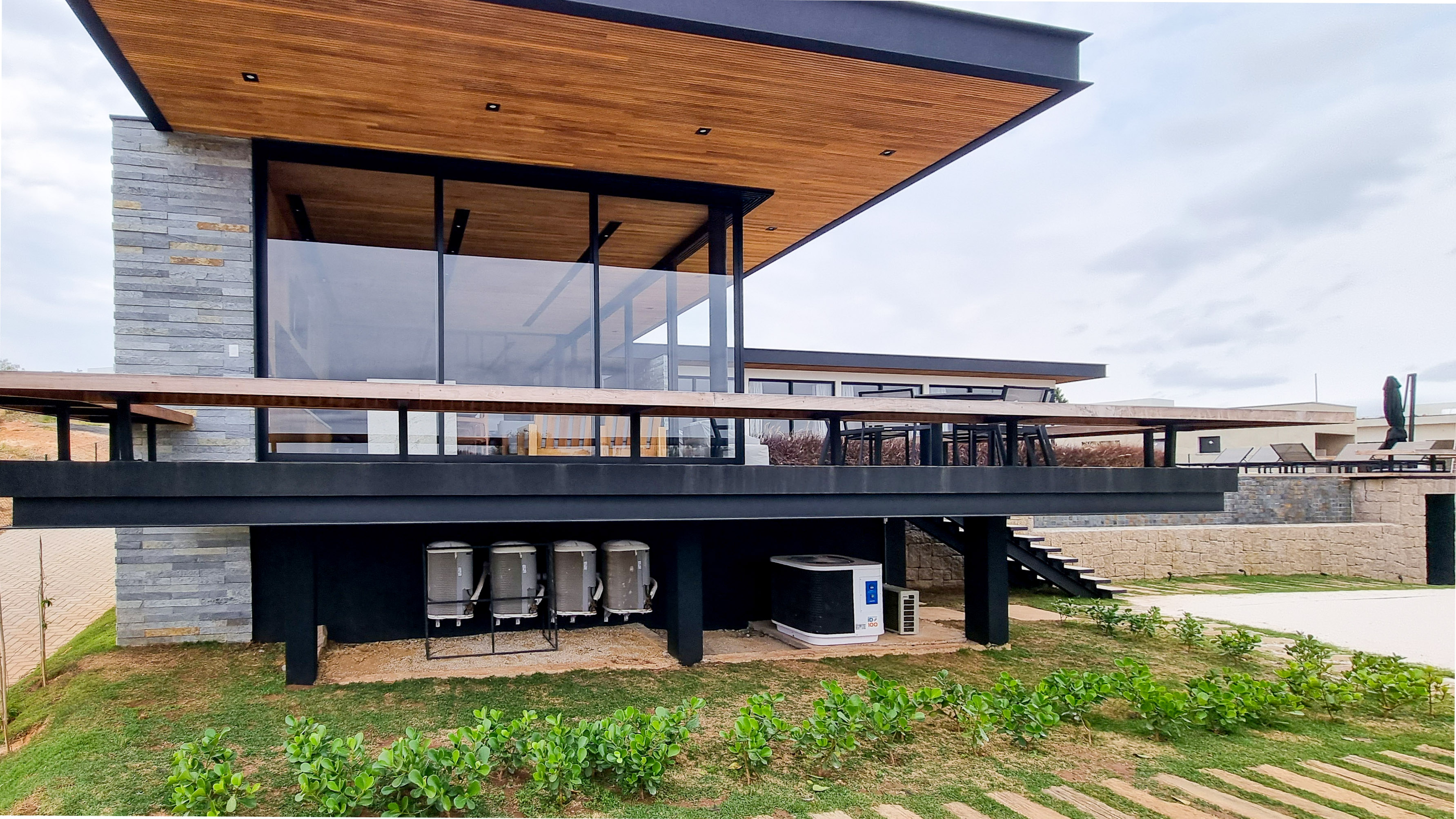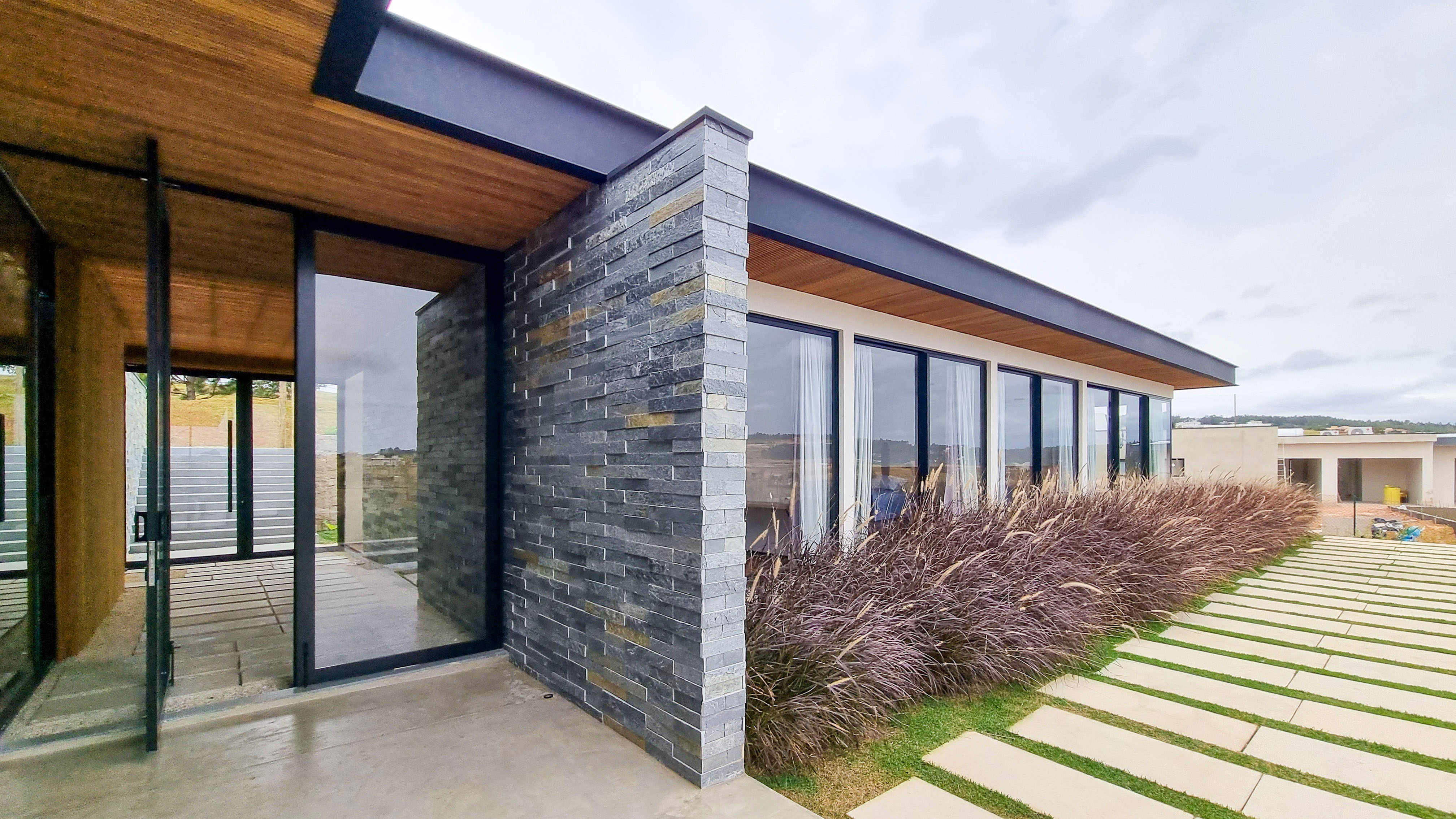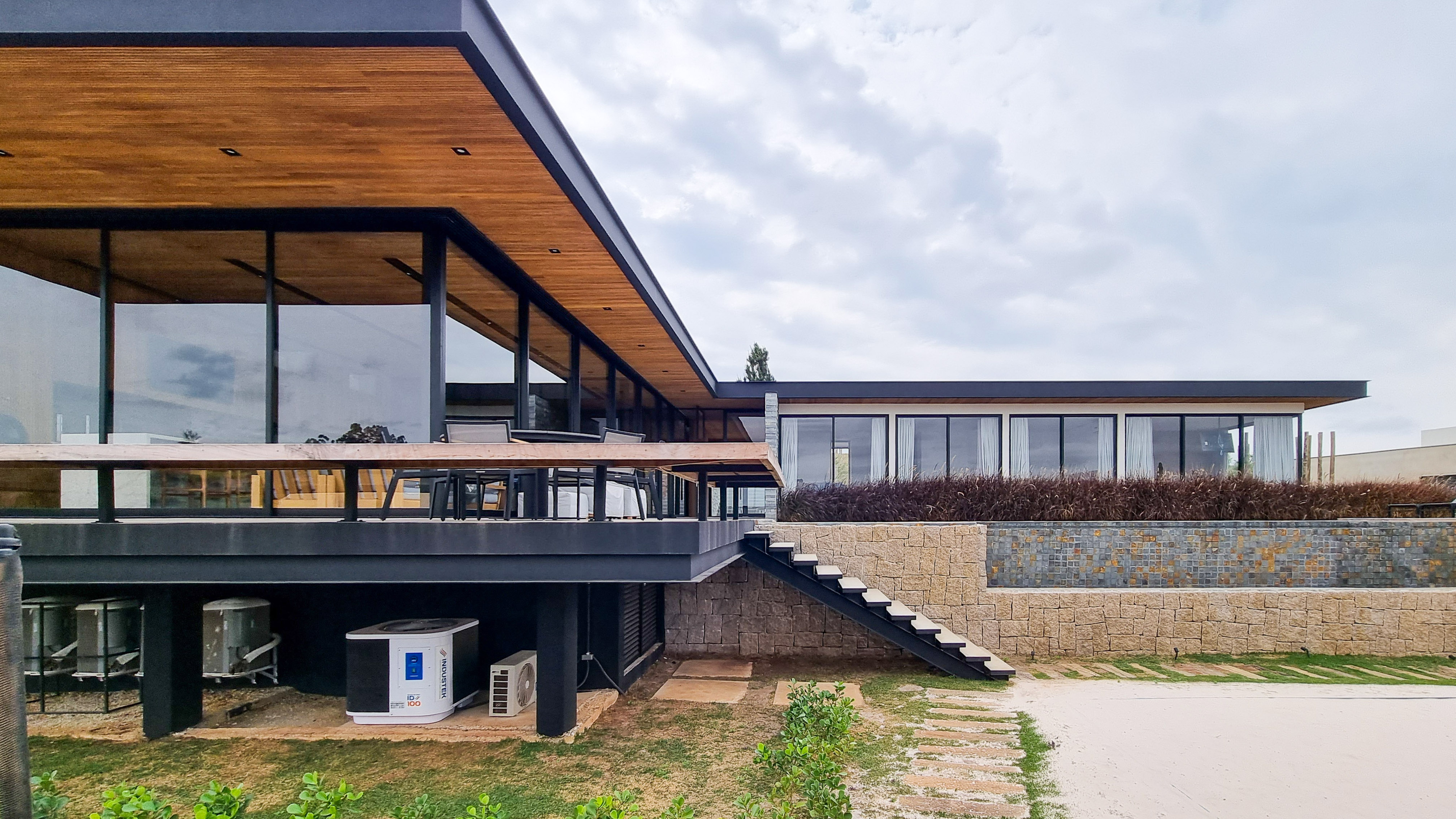 Um projeto onde a integração vai além de privilegiar a comunhão dos ambientes. Ele também entrega belas vistas de vários pontos devido à quantidade de vidros, outros elementos contemporâneos e minimalistas, como madeira, pedra e estrutura metálica, que imprimem modernidade e fazem com que tudo se conecte perfeitamente nesta casa.
