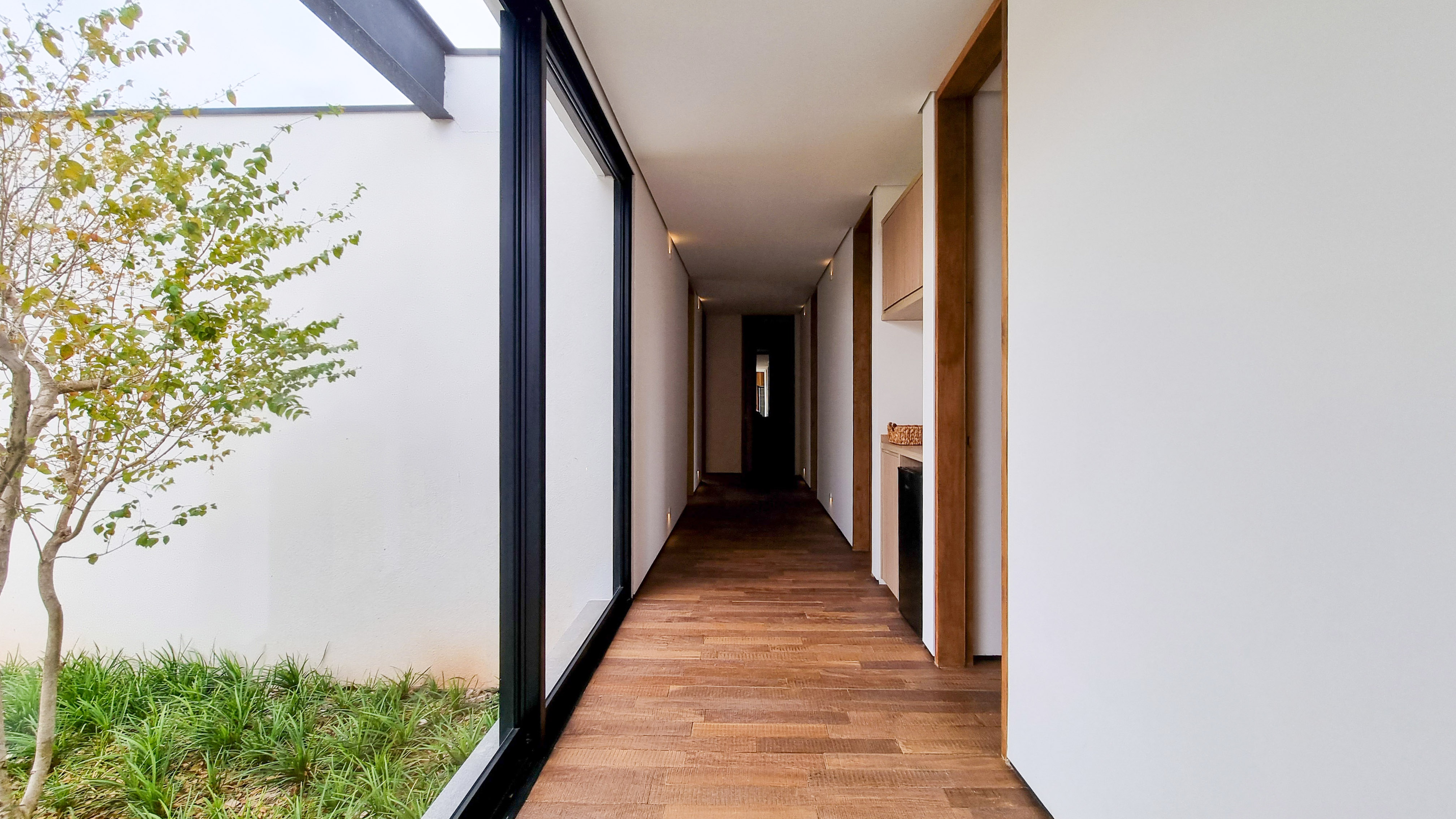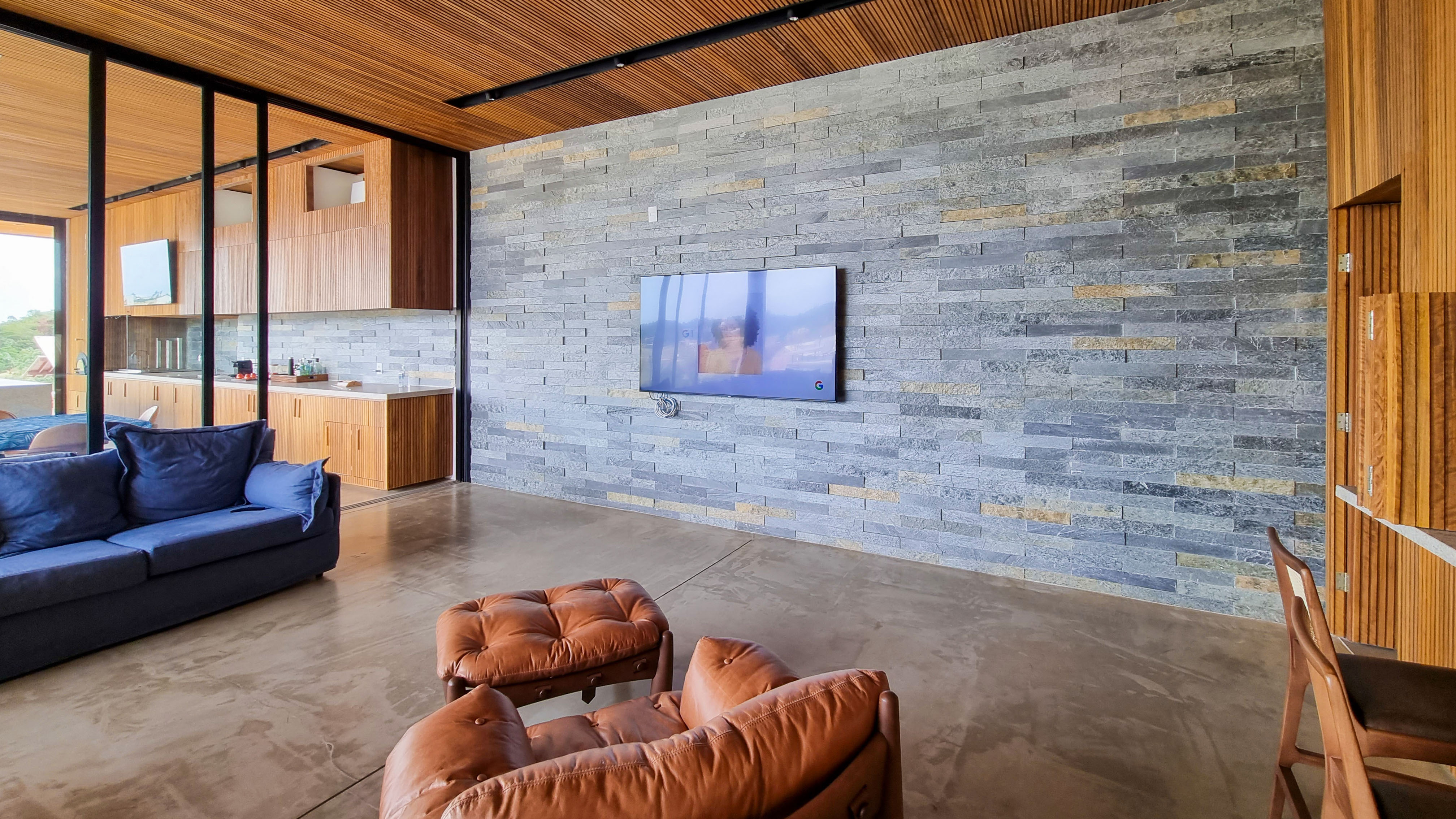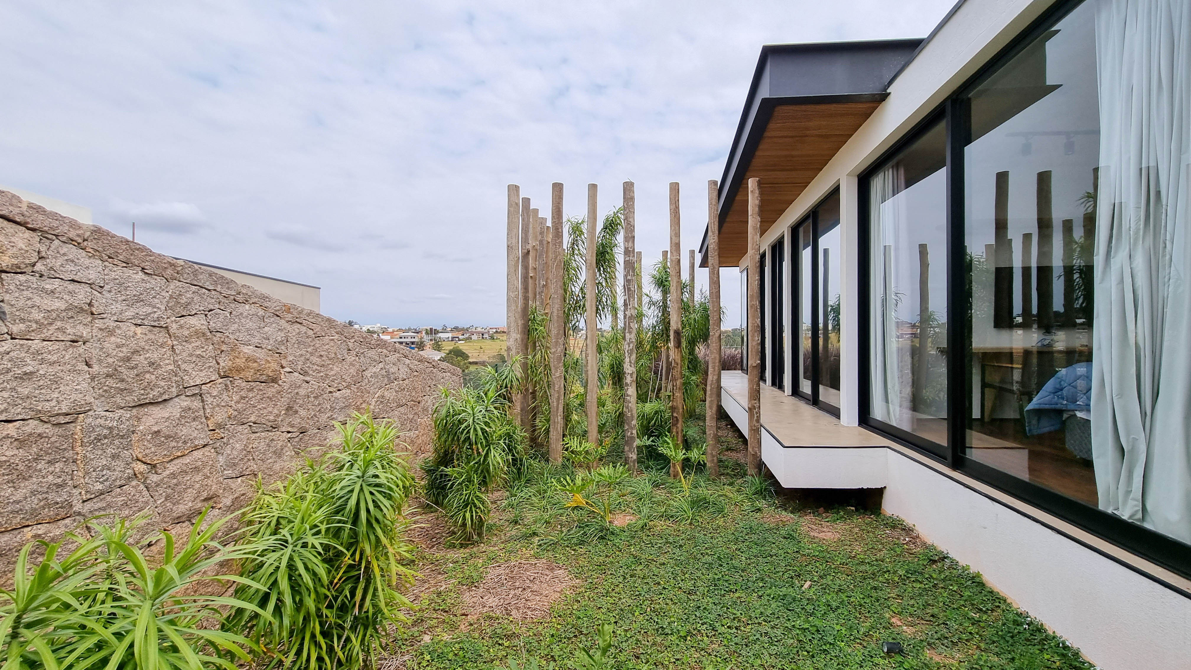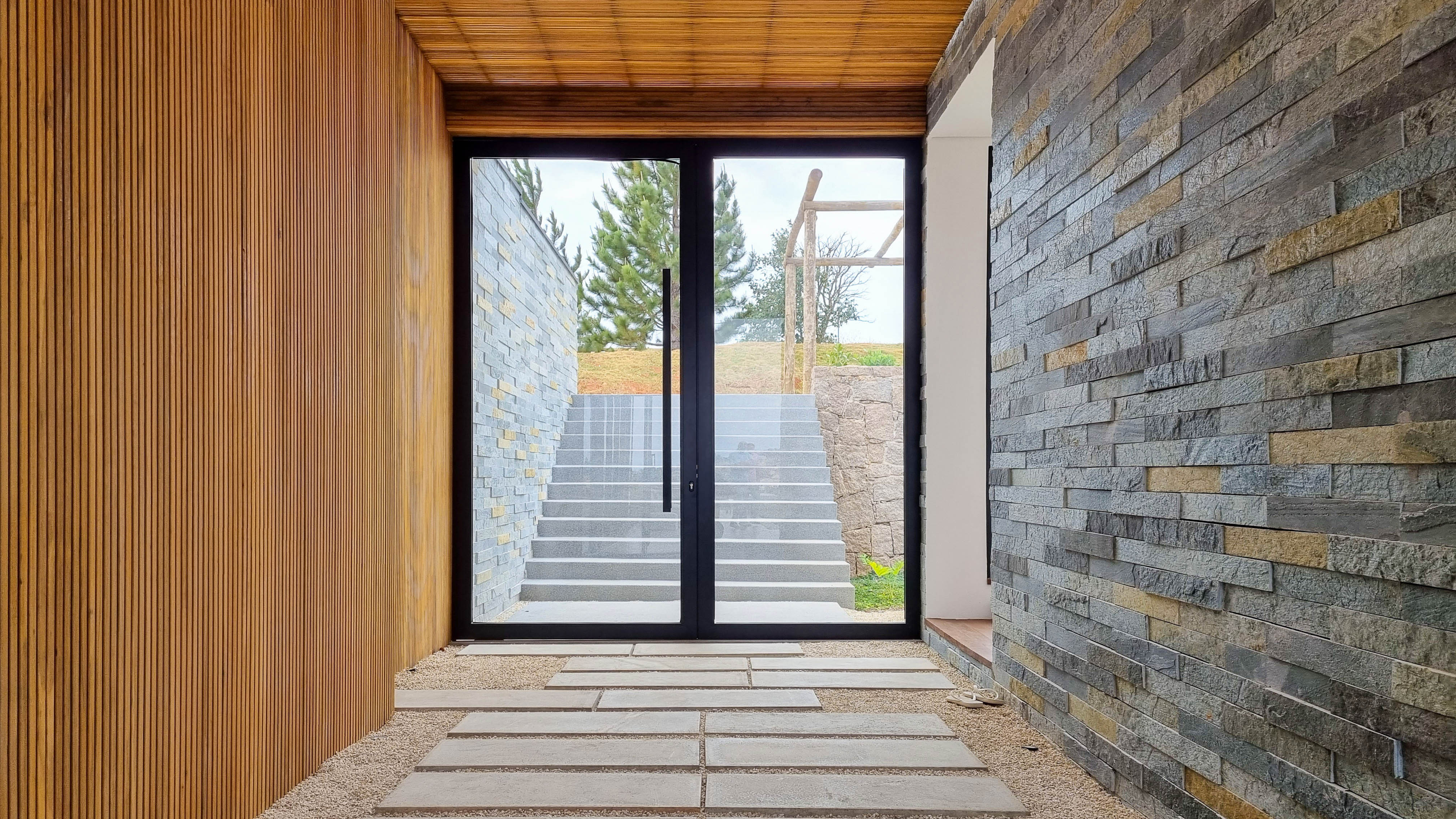 Um projeto onde a integração vai além de privilegiar a comunhão dos ambientes. Ele também entrega belas vistas de vários pontos devido à quantidade de vidros, outros elementos contemporâneos e minimalistas, como madeira, pedra e estrutura metálica, que imprimem modernidade e fazem com que tudo se conecte perfeitamente nesta casa.