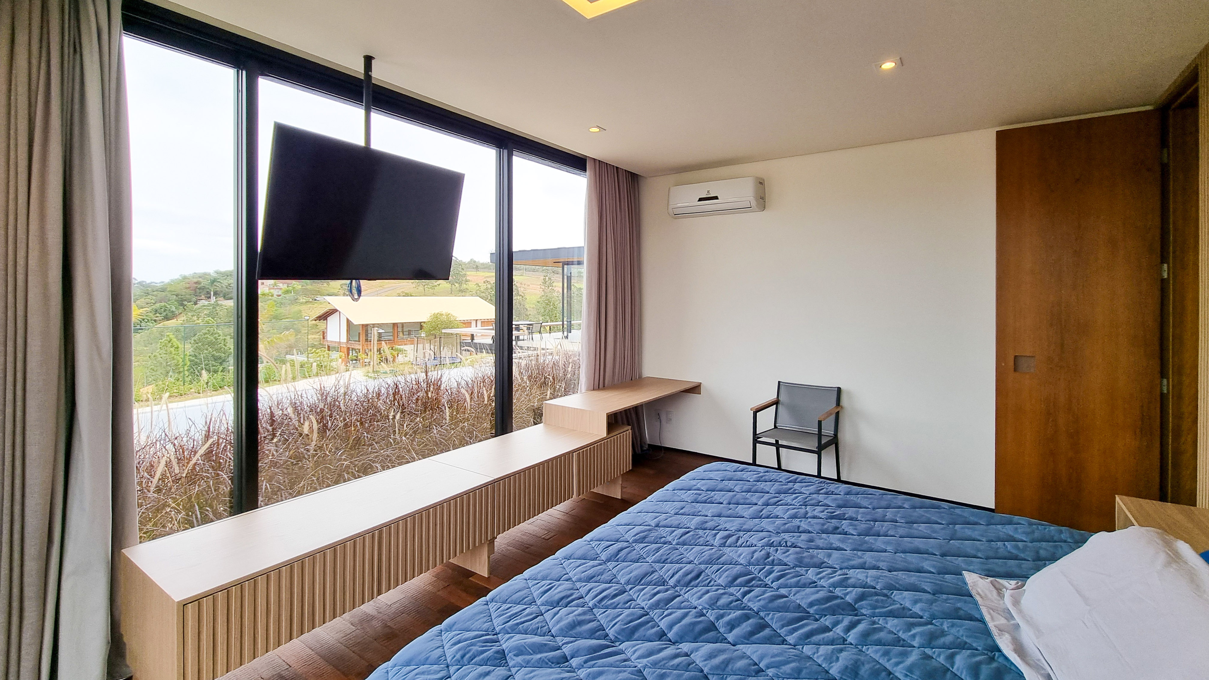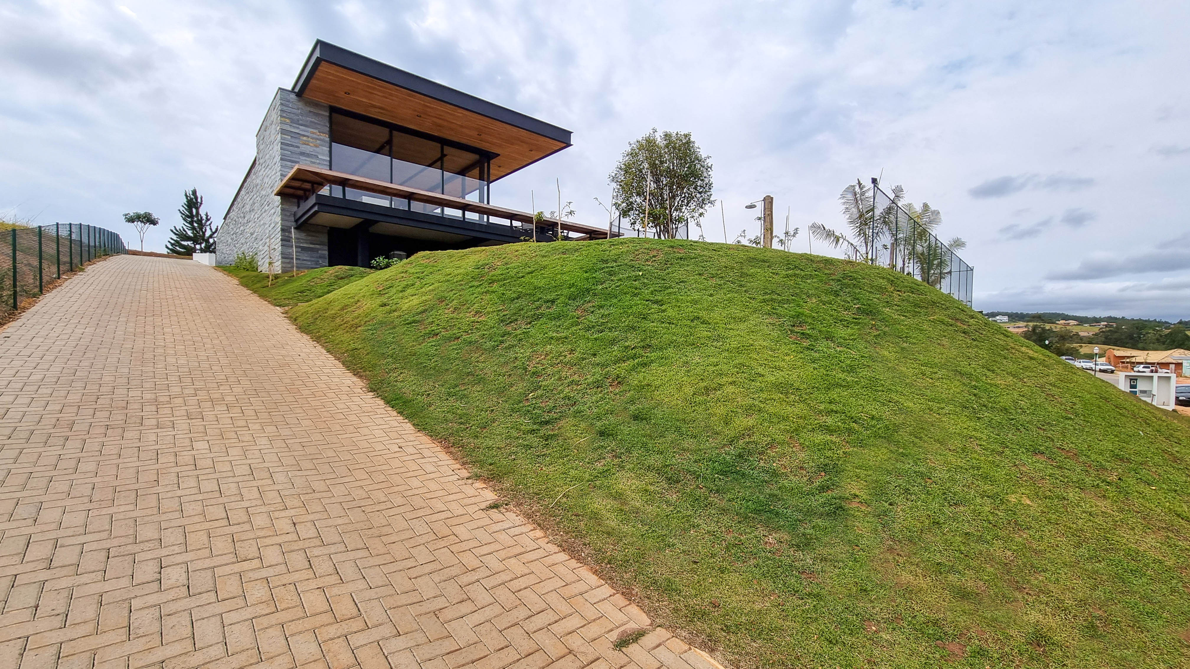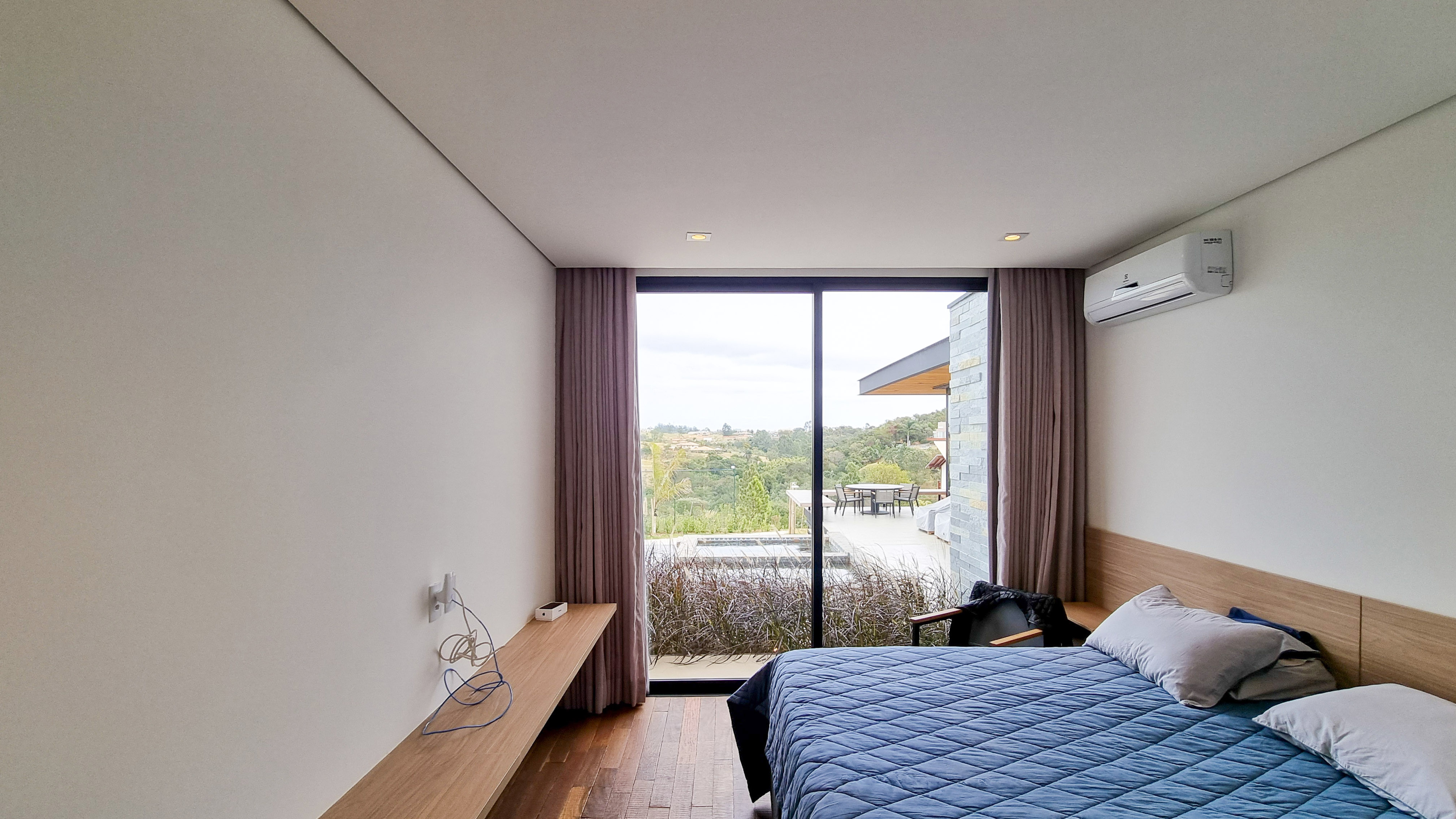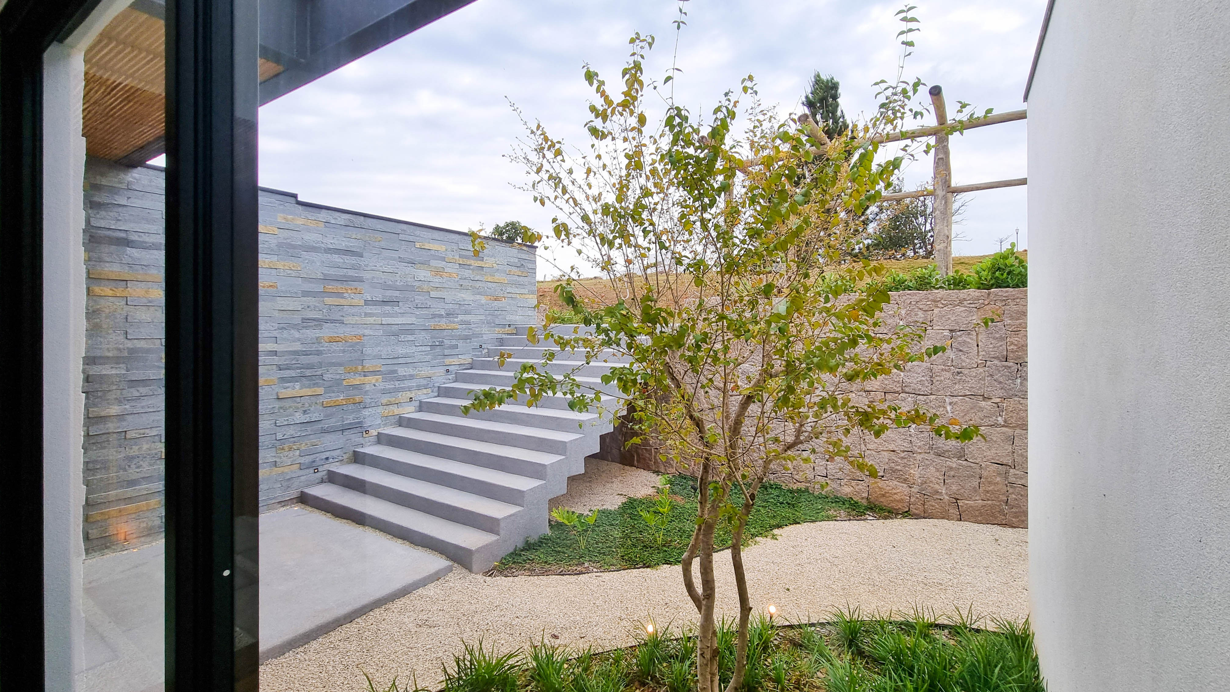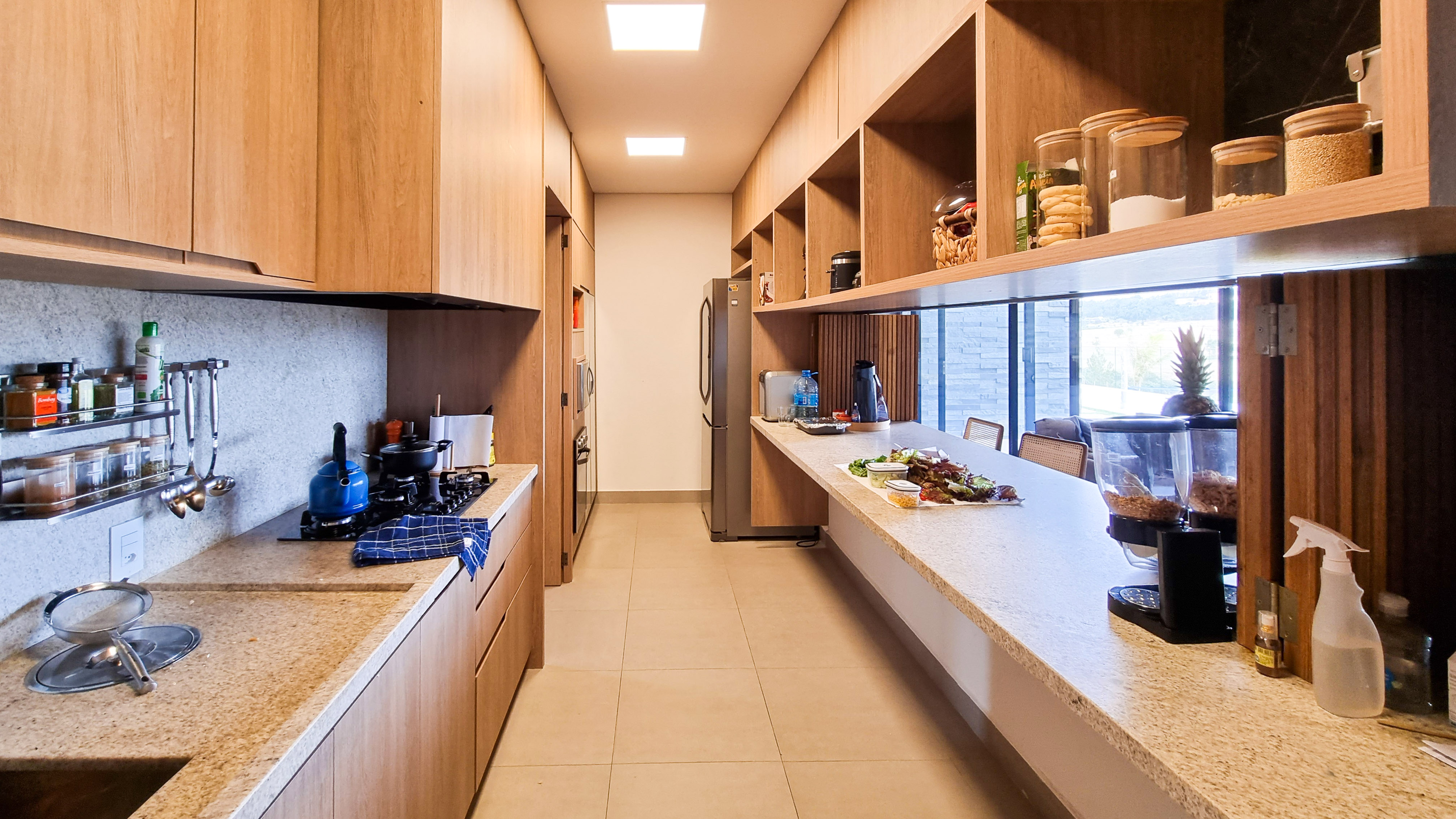 Um projeto onde a integração vai além de privilegiar a comunhão dos ambientes. Ele também entrega belas vistas de vários pontos devido à quantidade de vidros, outros elementos contemporâneos e minimalistas, como madeira, pedra e estrutura metálica, que imprimem modernidade e fazem com que tudo se conecte perfeitamente nesta casa.